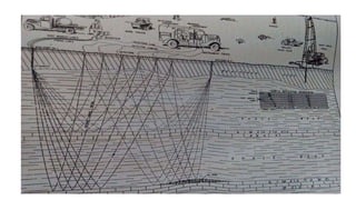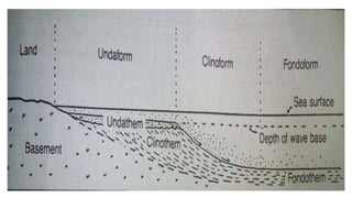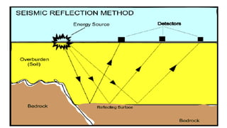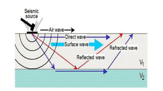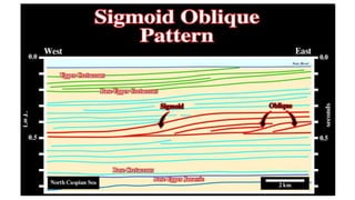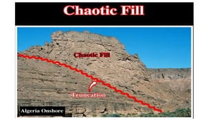 This document discusses seismic stratigraphy, which uses seismic data to extract stratigraphic information about subsurface rock layers. It defines seismic waves and methods, including refraction and reflection. Reflection seismic is more commonly used to identify structures like folds and faults beneath the surface. Key parameters for interpretation are reflection configuration, continuity, amplitude, frequency, and interval velocity. Depositional environments are also identified based on their relationship to the wave base.