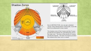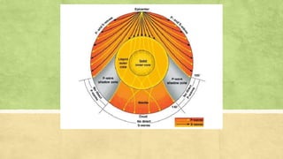 Seismic waves are waves of energy caused by earthquakes or explosions that travel through the earth or along its surface. There are two main types of seismic waves - body waves that travel through the earth's interior and surface waves that travel along the surface. P-waves are the fastest body waves and arrive first, followed by S-waves. Rayleigh waves are the most destructive surface waves and cause most earthquake shaking by rolling along the ground up and down and side to side. Observations of seismic wave speeds through the earth indicate that its interior consists of a solid rocky lithosphere and mantle, with liquid outer core and solid inner core.