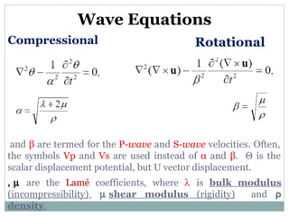 - Seismic velocities depend on properties like bulk modulus, shear modulus, and density.