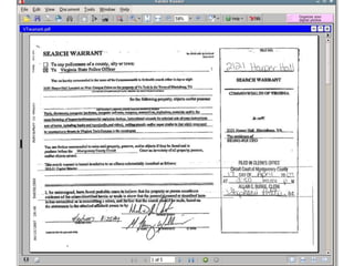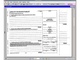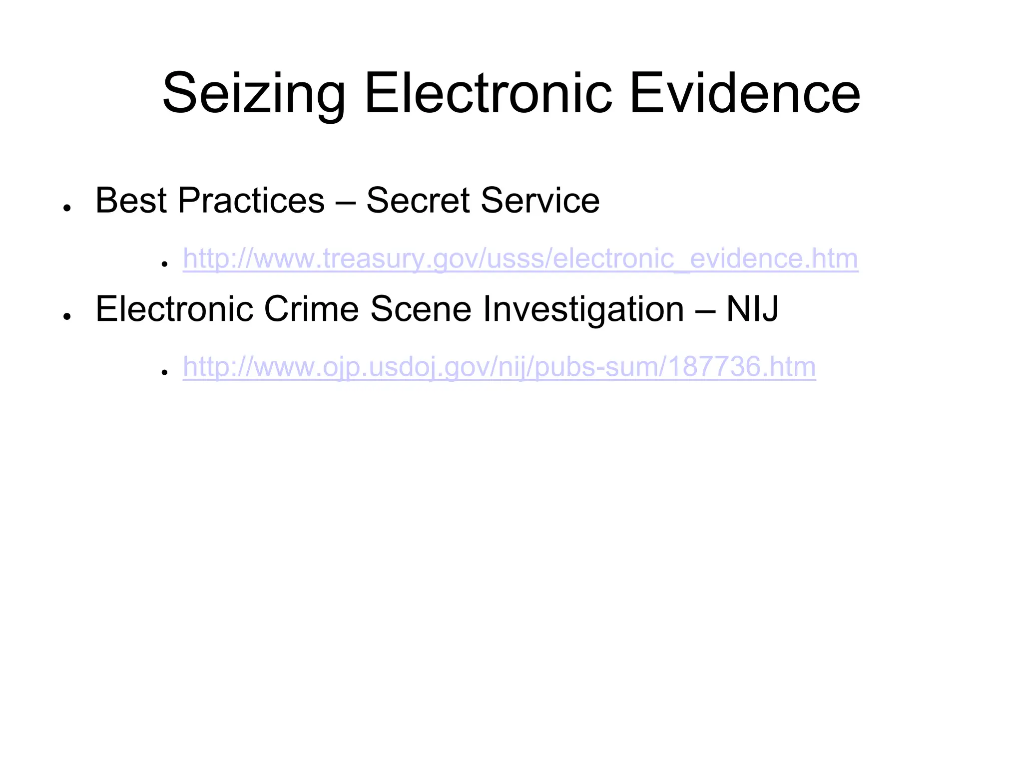 This document provides guidance on properly seizing electronic evidence from a crime scene. It emphasizes the importance of planning, documenting every step with photos and logs, and separating hardware from networks to preserve volatile data. Key steps include: securing the location, photographing everything in detail before collection, using tags and logs to maintain a chain of custody, and being aware of potential legal liabilities from disrupting business data. The goal is to collect all potential digital evidence while ensuring its integrity and admissibility in court.