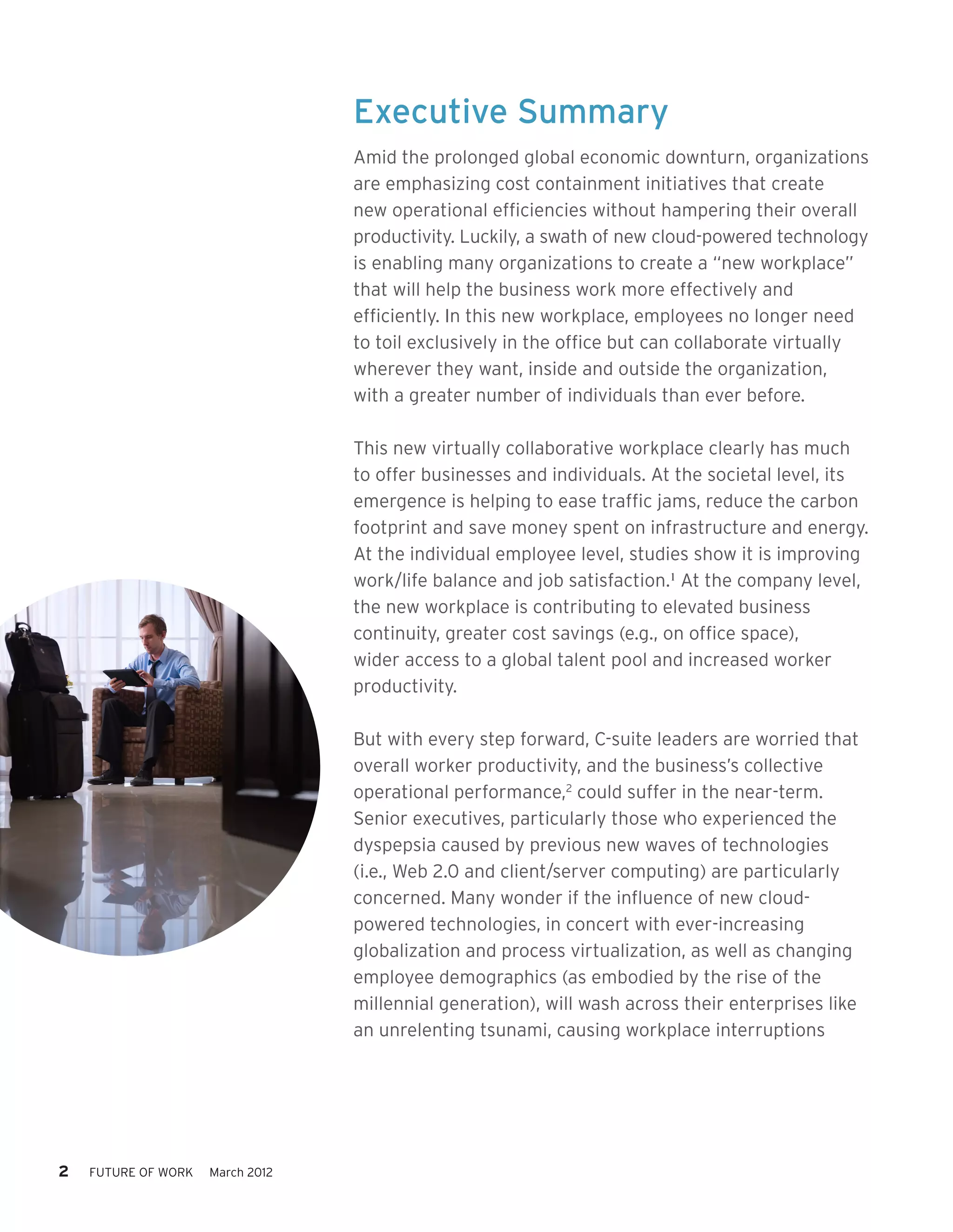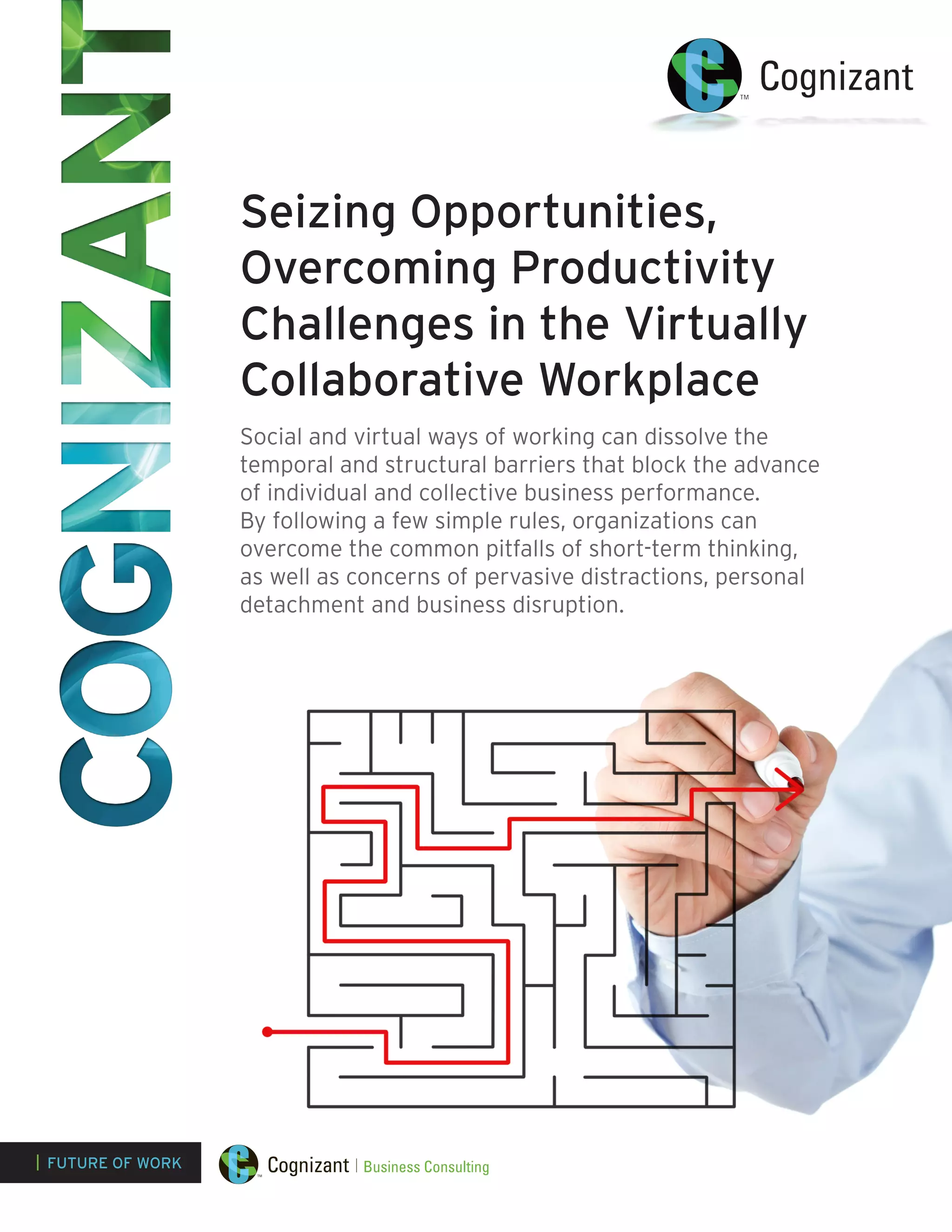 The document discusses the emergence of a virtually collaborative workplace that overcomes traditional barriers to productivity, enabling organizations to capitalize on new cloud-powered technologies and improve efficiency. However, it also highlights the challenges of information overload, social isolation, and the need for appropriate collaboration tools and management practices to maximize benefits while minimizing drawbacks. Ultimately, successful adaptation to this new work environment requires a comprehensive strategy that integrates technology, workplace design, and employee engagement.