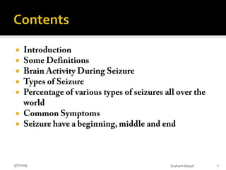 The document discusses different types of seizures, including primary generalized seizures which involve both sides of the brain at once and partial seizures which begin in a limited area of the brain. It provides details on different types of primary generalized seizures such as absence seizures, atypical absence seizures, myoclonic seizures, atonic seizures, and tonic seizures; describing their characteristics, symptoms, typical age of onset, and other clinical features. The document also mentions that electroencephalograms can help identify seizure disorders by recording abnormal electrical brain wave patterns during seizures.