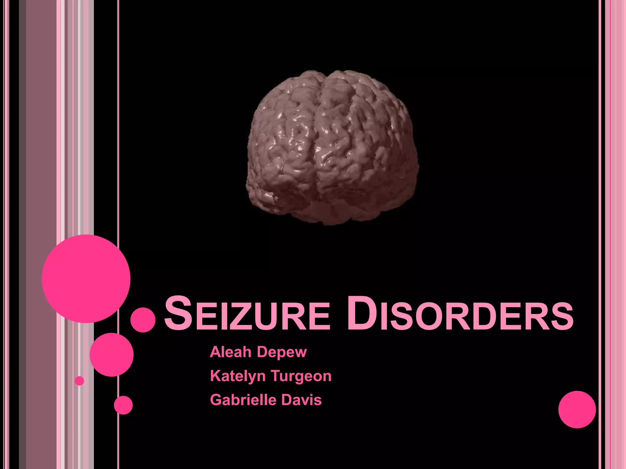 Seizure disorders occur when there is a surge of electrical activity in the brain that causes seizures. There are over 40 types of seizures that vary in severity and symptoms. The two most common categories are generalized seizures, which affect the entire brain, and partial seizures, which affect only one part of the brain. As a teacher, it is important to be aware of a student's seizure needs and form an emergency plan with the student and family. The plan should outline medication schedules, contact information, and procedures for responding to seizures. Teachers should also provide academic accommodations like extra time, breaking down assignments, and using organizational strategies to help students with seizure-related memory and focus issues.