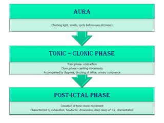 3. Nursing care focuses on preventing injury during seizures, reducing fears and improving coping, providing education to patients and families, and monitoring for complications of prolonged seizure activity and medication side effects.