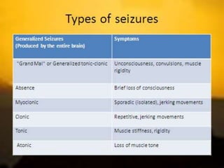 Epilepsy is a brain disorder caused by disturbed neuronal activity in the brain, which can cause strange sensations, emotions, behaviors, or sometimes convulsions. It is classified as either primary generalized or partial seizures. Diagnosis involves EEG, brain imaging, and blood tests to identify potential causes. Treatment primarily consists of anti-seizure medications, but may also include dietary therapies, vagus nerve stimulation, or surgery to remove the affected part of the brain.