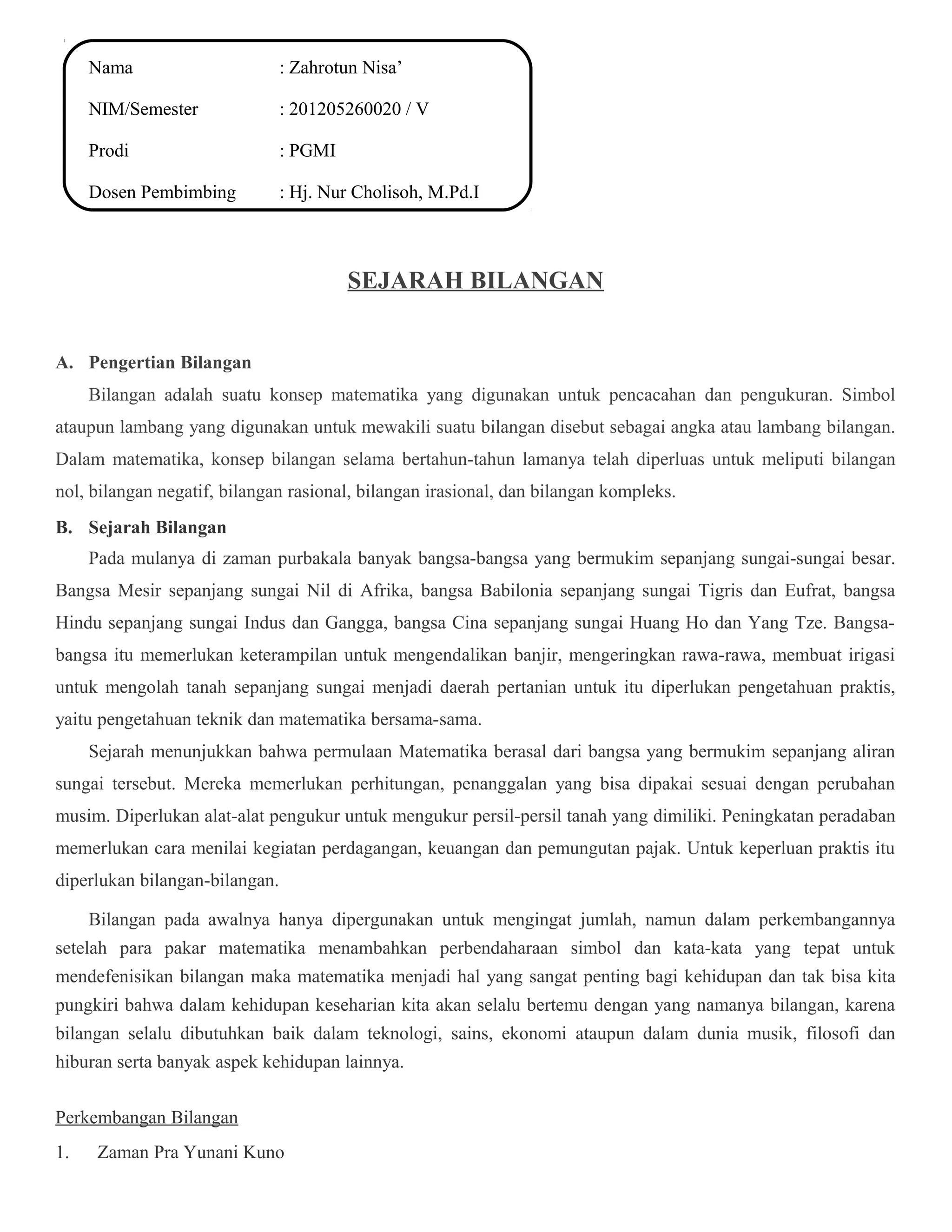 Dokumen ini membahas sejarah bilangan dari zaman purbakala hingga modern, menjelaskan pentingnya bilangan dalam kehidupan sehari-hari dan perkembangannya dalam matematika. Pengetahuan tentang bilangan dimulai dari kebutuhan praktis dalam perhitungan dan pengukuran untuk pertanian dan perdagangan, serta berlanjut ke penemuan sistem penulisan angka yang digunakan saat ini. Berbagai jenis bilangan seperti bilangan bulat, prima, rasional, dan kompleks juga dijelaskan.