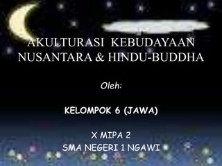 Dokumen tersebut membahas akulturasi antara budaya Indonesia dengan Hindu-Buddha pada berbagai aspek seperti seni, sistem kepercayaan, dan sistem pemerintahan. Unsur-unsur budaya asing tersebut diolah sesuai konteks Indonesia tanpa menghilangkan identitas asli.