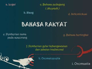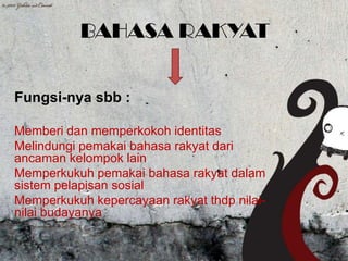 Bahasa rakyat memiliki berbagai fungsi seperti memberi identitas, melindungi kelompok, dan memperkuat kepercayaan budaya. Jenis bahasa rakyat antara lain logat daerah, bahasa gaul, bahasa pedagang, sirkomlokusi, pemberian nama, bahasa bertingkat, onomatopoetik, dan onomastik.