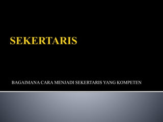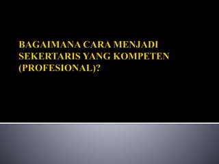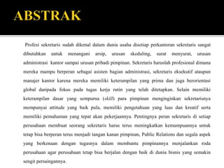 Dokumen ini membahas tentang pentingnya profesi sekretaris dalam dunia bisnis, yang mencakup keterampilan administratif, komunikasi, dan etika kerja yang baik. Seorang sekretaris yang kompeten harus mampu beradaptasi dengan kemajuan teknologi dan meningkatkan kualitas diri untuk mendukung pimpinan dalam menjalankan tugasnya. Tugas-tugas serta tanggung jawab sekretaris sangat beragam, mulai dari administrasi hingga menjaga rahasia perusahaan.