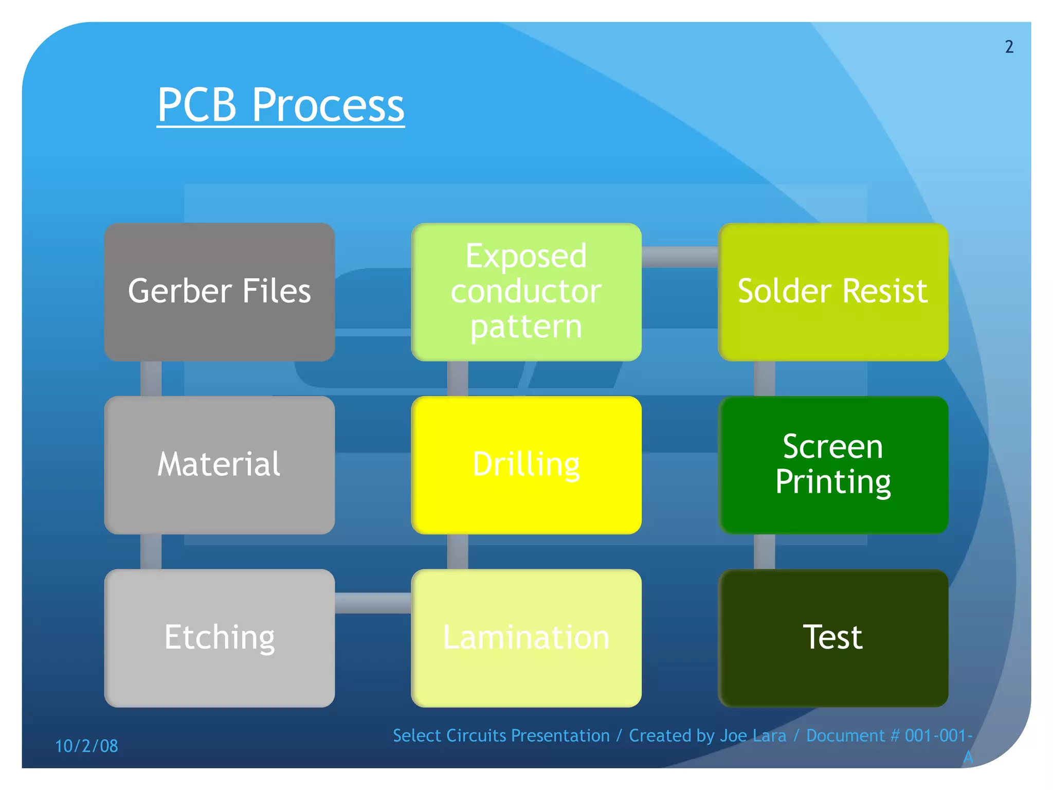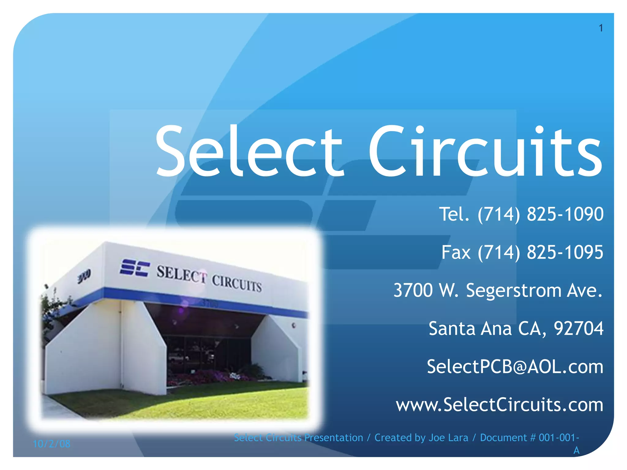 The document is a presentation from Select Circuits that discusses their printed circuit board (PCB) manufacturing process. It covers the various stages of PCB production including inner layer layup, materials used, drilling, silk screening, solder masking, heat sinks, surface finishes, and gold plating of connectors. It also provides information on Select Circuits' prototype, small run, and large volume production capabilities.