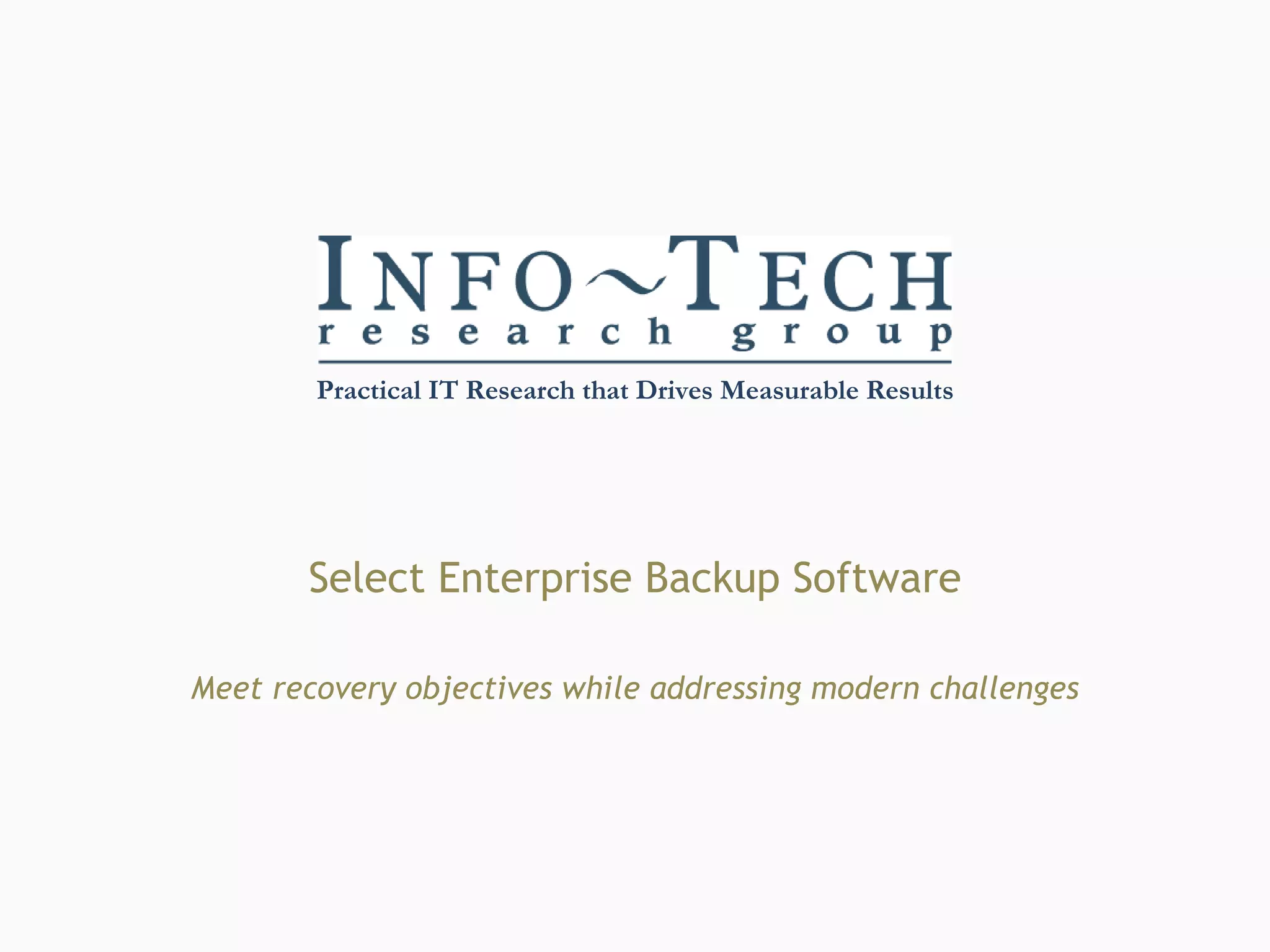 Organizations must evaluate their backup software regularly to align with recovery objectives amidst changing data environments. With increasing virtualization and evolving storage needs, it's critical to assess alternatives to ensure that backup solutions effectively support data recovery requirements. The document provides guidance on selecting backup solutions, emphasizing the importance of features like deduplication and virtualization while recommending vendor assessments and strategic planning for implementation.