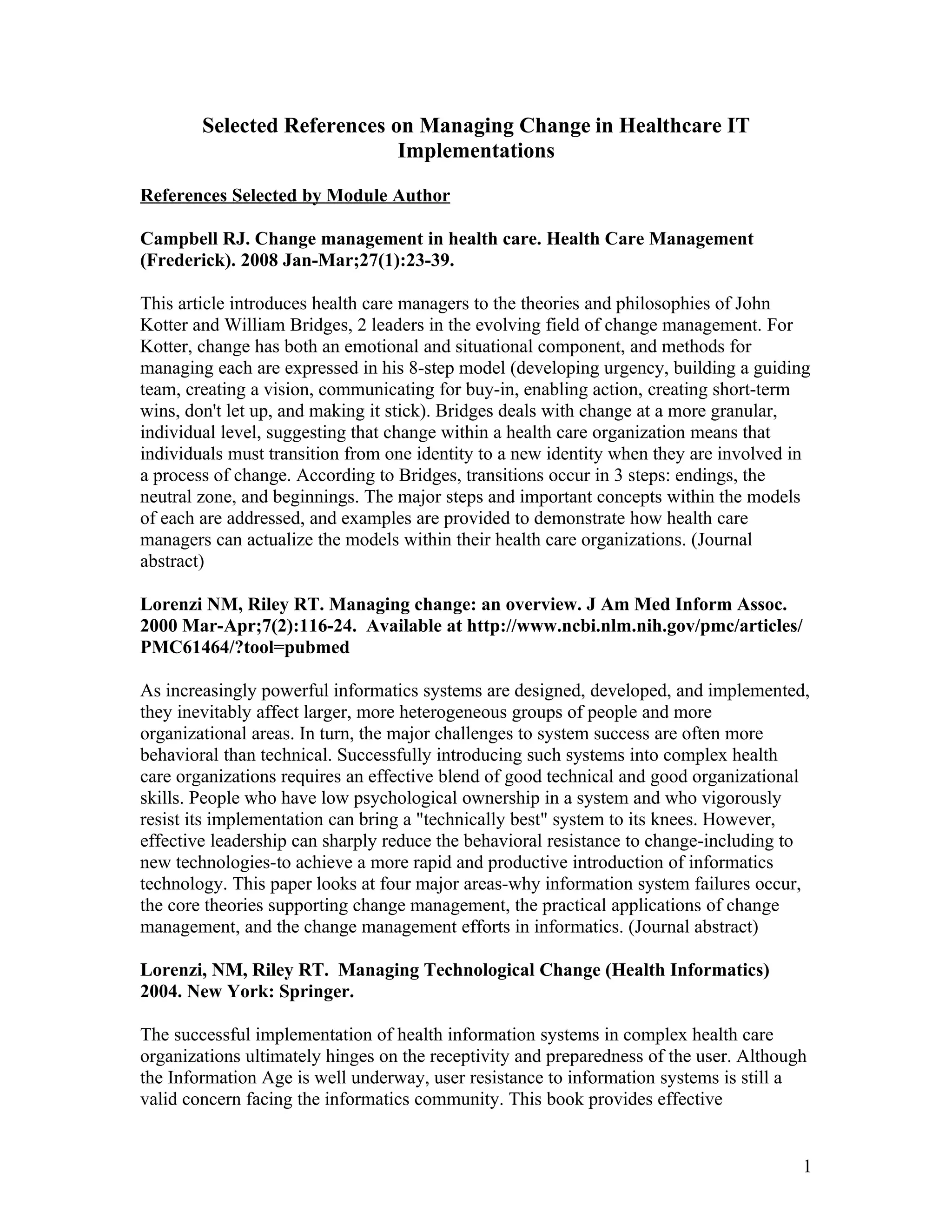 This document provides summaries of several references related to managing change in healthcare IT implementations. The references discuss: