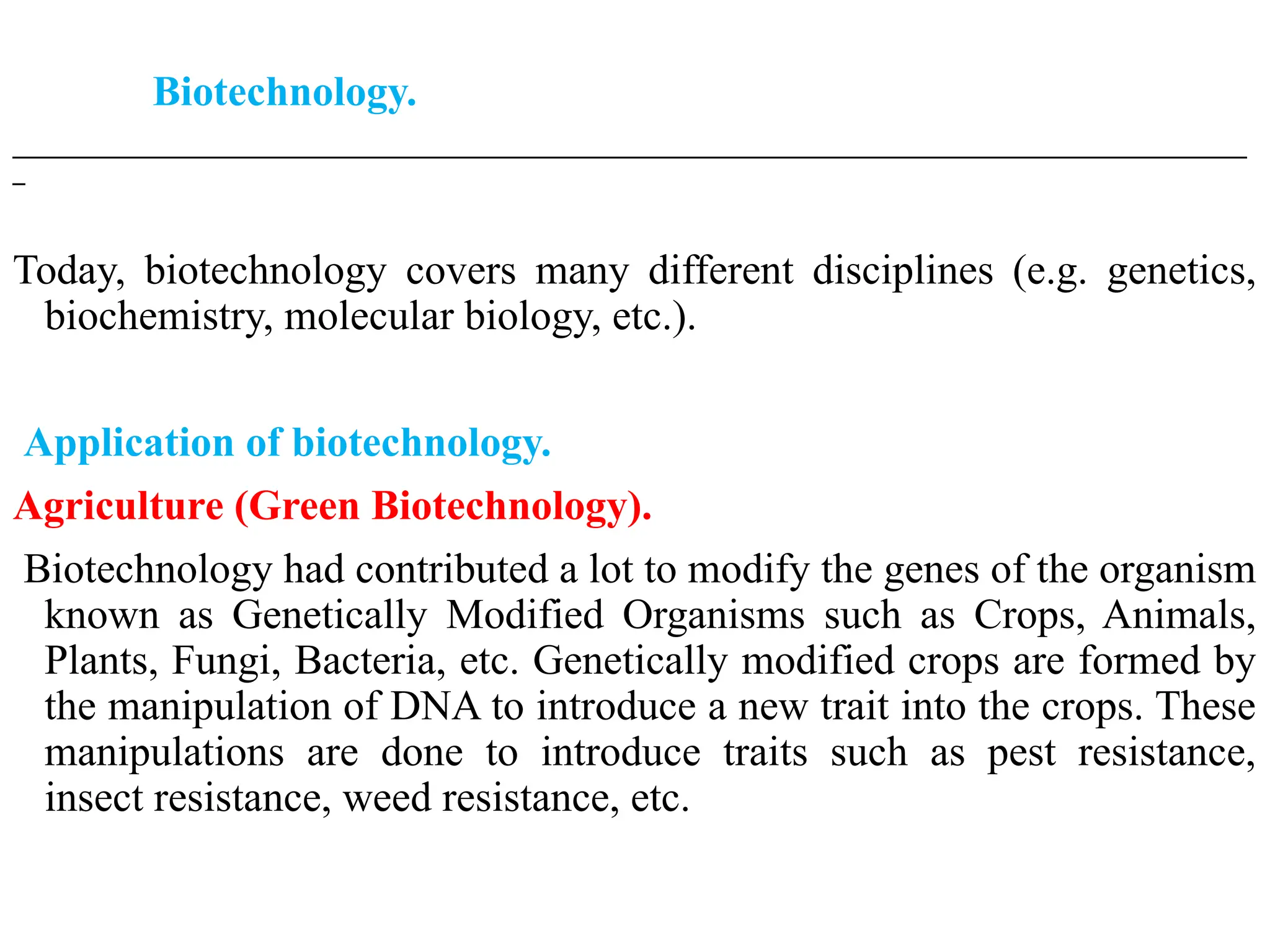 Today, biotechnology coversmany different disciplines (e.g. genetics,
