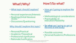 Selecting a research topic involves considering what topic to explore based on personal experiences, interests from initial readings and discussions, and determining why this topic should be explored for personal, academic, theoretical or professional significance. It also requires determining how to explore the topic through methodological considerations and feasibility of execution, and considering what the outcomes might be at a personal, academic or professional level at the end of the study.