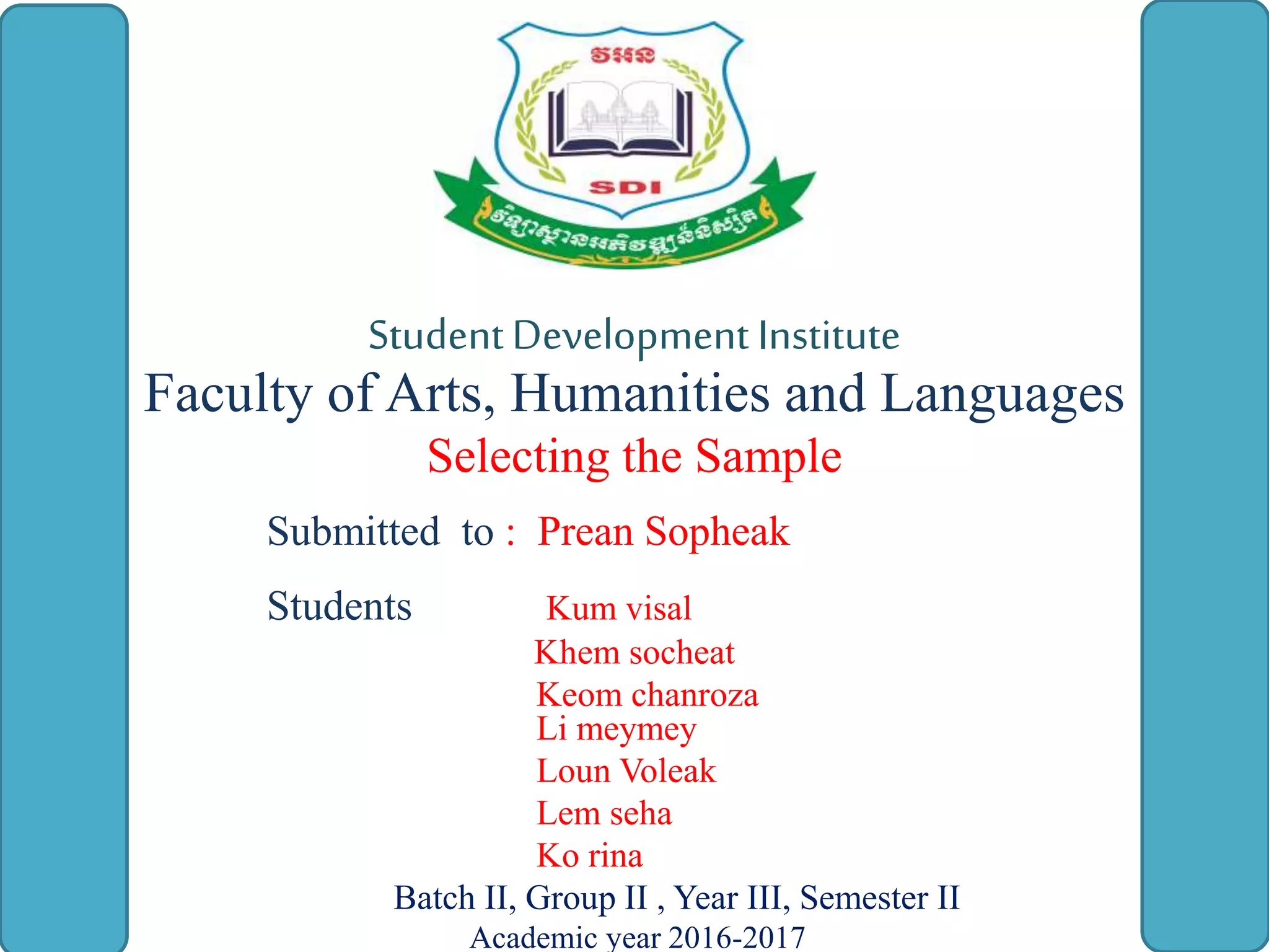 This document provides information about selecting samples for research. It discusses key concepts like population, sample, sampling unit and frame. It describes different types of sampling designs including random, non-random, and mixed methods. Random sampling designs discussed include simple random sampling, stratified random sampling, and cluster sampling. Non-random designs include convenience, quota, judgmental, and snowball sampling. Systematic sampling is classified as a mixed method. Factors that influence sample size calculations are level of confidence, accuracy, and population variation. Sample size should allow for precise estimates while avoiding bias in selection.