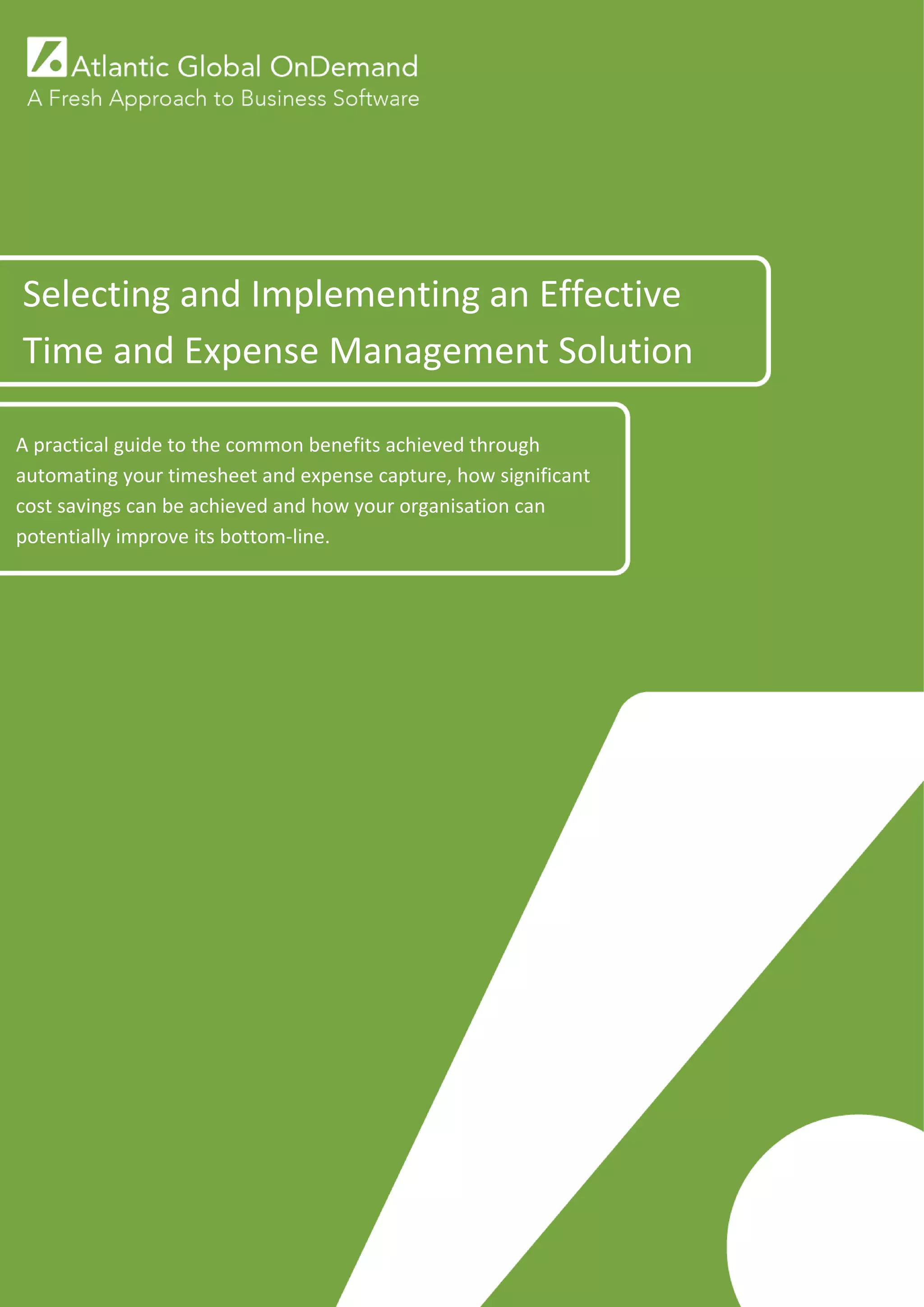 This document serves as a practical guide for organizations looking to implement an effective time and expense management solution, emphasizing benefits such as improved project cost control, reduced billing cycles, and better data quality. It compares options like client-installed software versus Software as a Service (SaaS) and discusses key features, compliance, data accuracy, and user interfaces. The guide includes real client case studies and concludes with top recommendations for successful implementation.