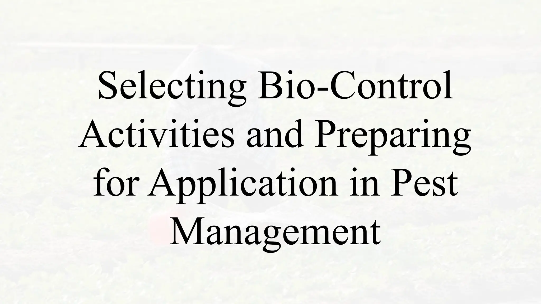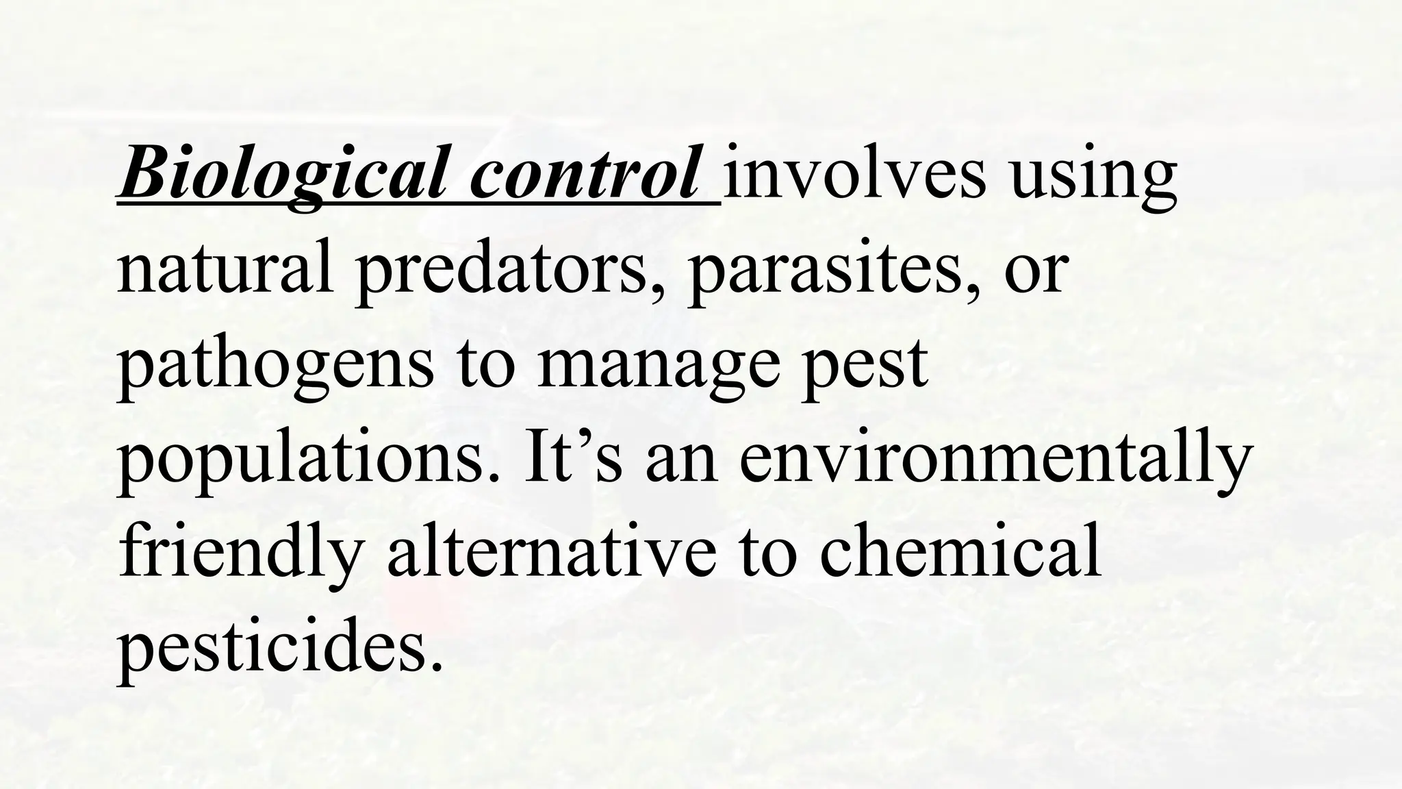 Biological control uses natural predators, parasites, or pathogens to manage pest populations as an eco-friendly alternative to chemical pesticides. Effective pest management involves identifying pests, selecting appropriate bio-control agents, and monitoring the results for continued effectiveness. Preparation steps include assessing pest problems, selecting and rearing bio-control agents, applying them, and evaluating their success.