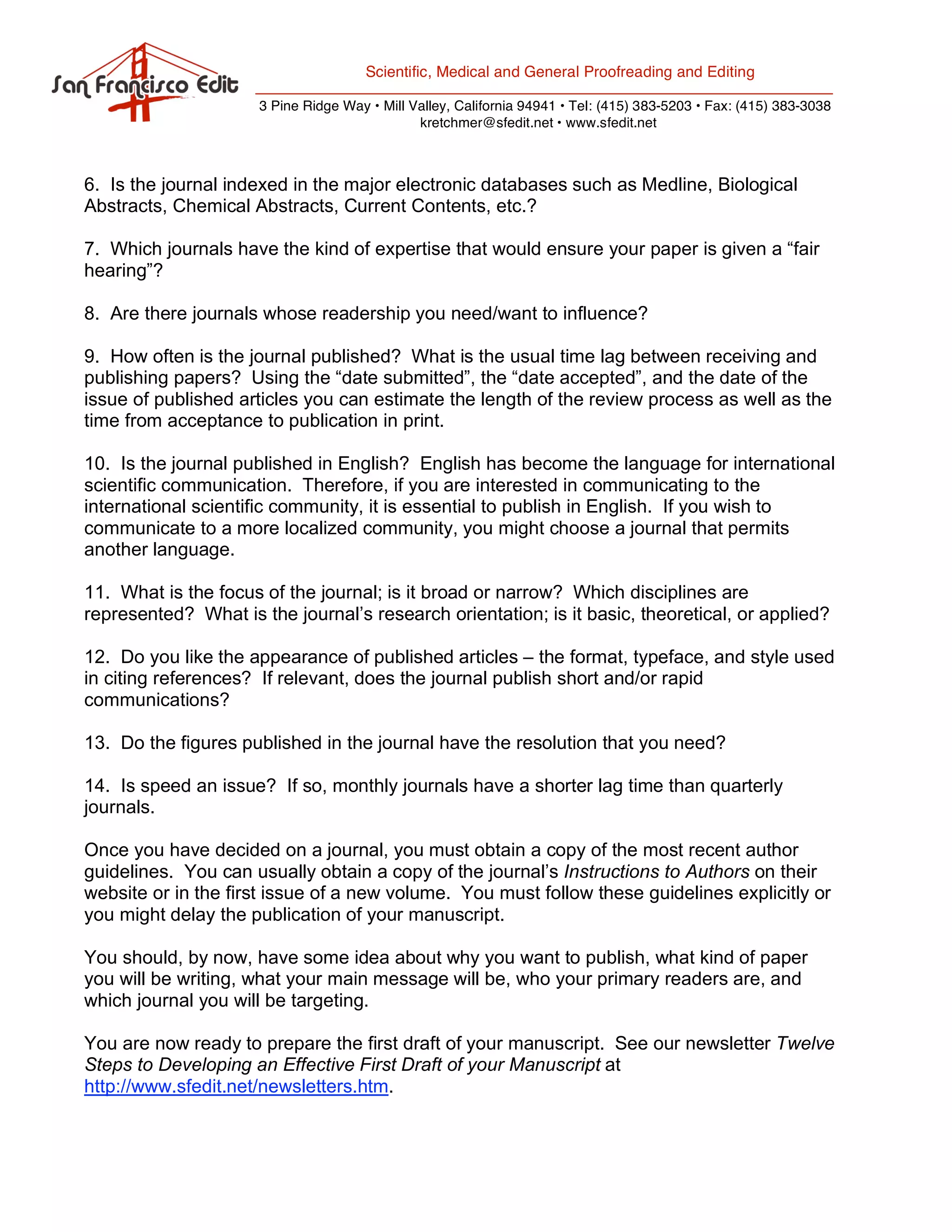 This document provides guidance on selecting a journal to publish a research manuscript in. It outlines 14 factors to consider when choosing a journal, such as whether it is peer-reviewed, publishes similar topics, has a good reputation in the field, is indexed in major databases, and matches the intended audience. Following journal guidelines exactly is also important. Narrowing options based on these criteria helps ensure the manuscript is submitted to the most appropriate journal.