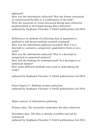 The document discusses various methods of data collection in research, highlighting differences between quantitative, qualitative, and mixed methods approaches. It covers primary and secondary data sources, observation techniques, interviews, and questionnaires—pointing out their advantages and disadvantages, as well as challenges in formulating questions and constructing research instruments. Key considerations include the philosophical approach, data format, analysis methods, and how findings are communicated.