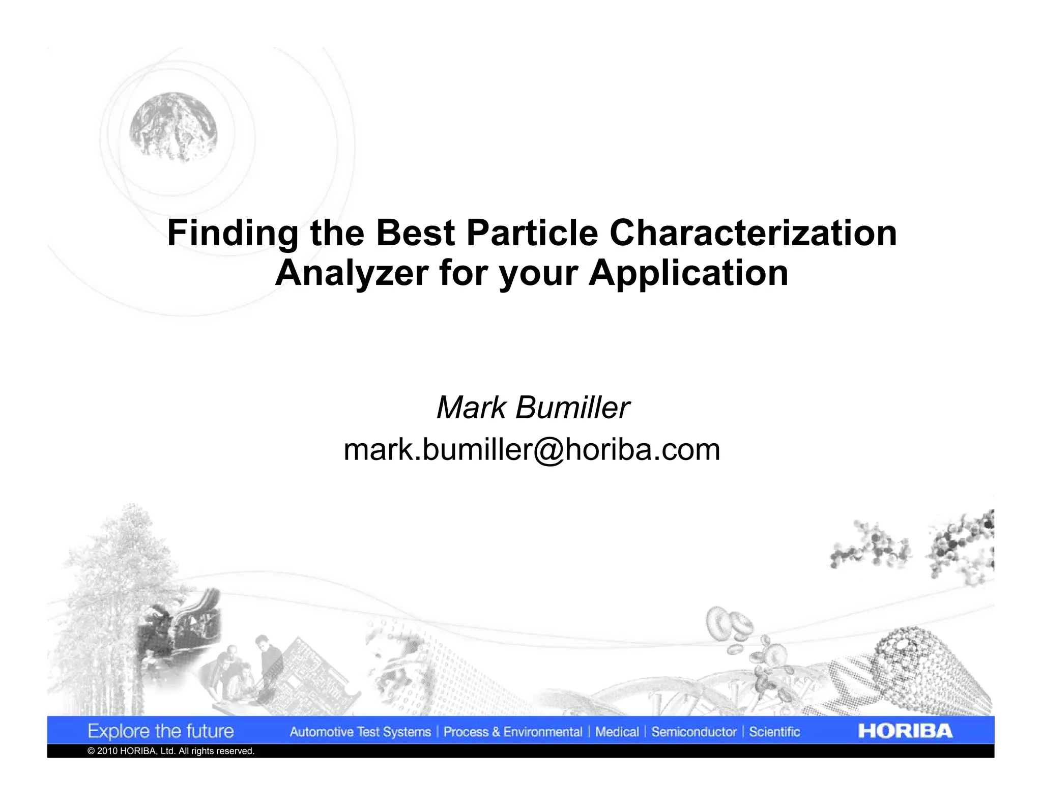 The document discusses the selection of particle characterization analyzers based on specific application needs, including factors such as measurement purpose, sample type, and data requirements. It reviews various techniques for particle characterization, including size analysis, zeta potential measurement, and image analysis, highlighting the importance of understanding sample behavior, type, and industry standards. The document emphasizes the necessity of defining suitable methods for accurate analysis, suggesting that no single technique fits all applications.