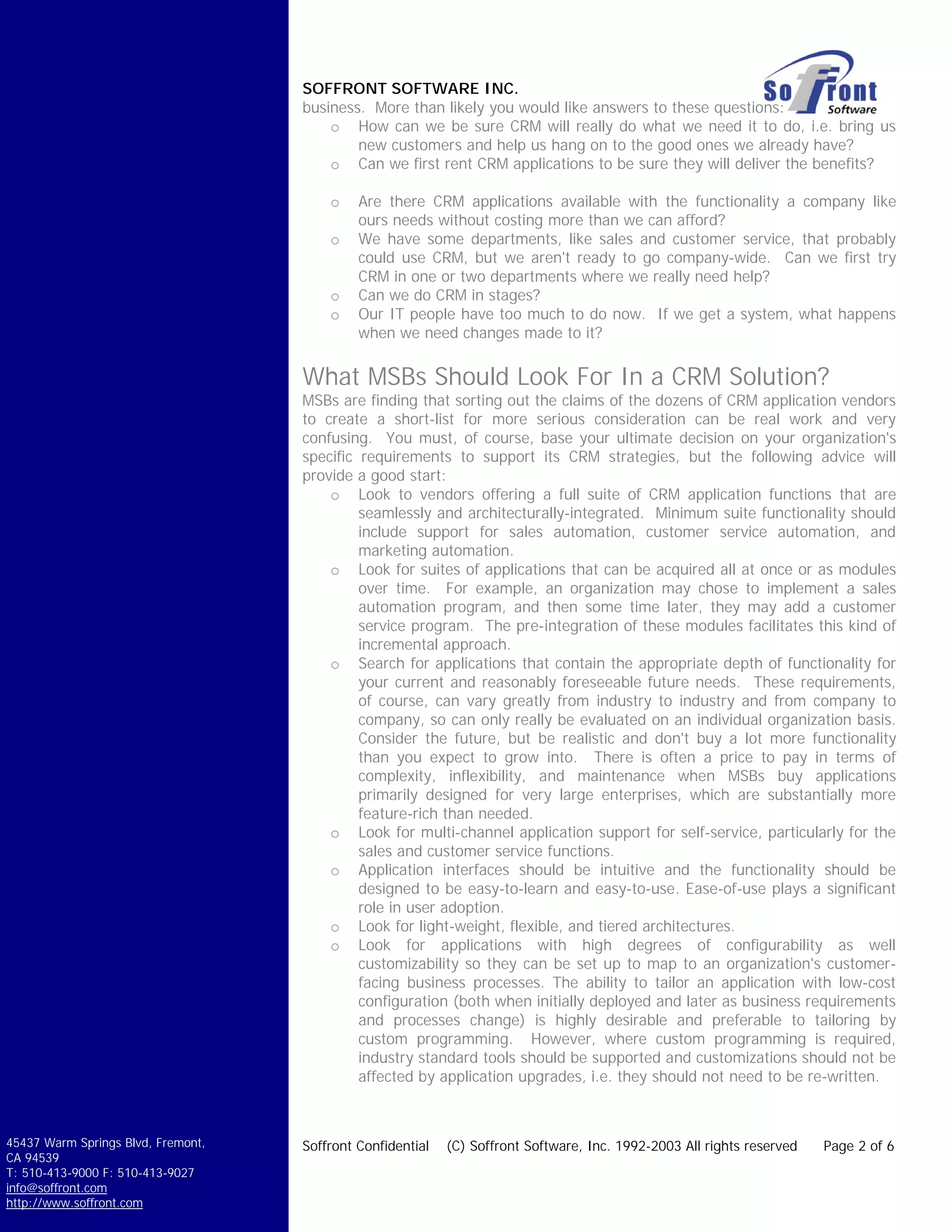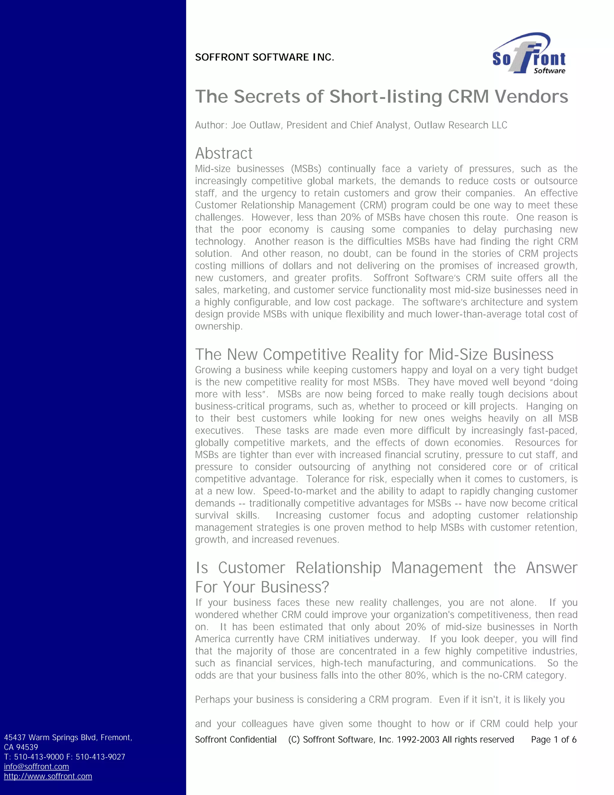 The document discusses challenges facing mid-sized businesses and how customer relationship management (CRM) software can help address them. It provides advice for mid-sized businesses on selecting a CRM vendor, highlighting features like flexibility, configurability, low total cost of ownership, and support for incremental implementation. Soffront Software's CRM suite is presented as offering all necessary sales, marketing and customer service functionality in a highly configurable and low-cost package designed specifically for mid-sized companies.