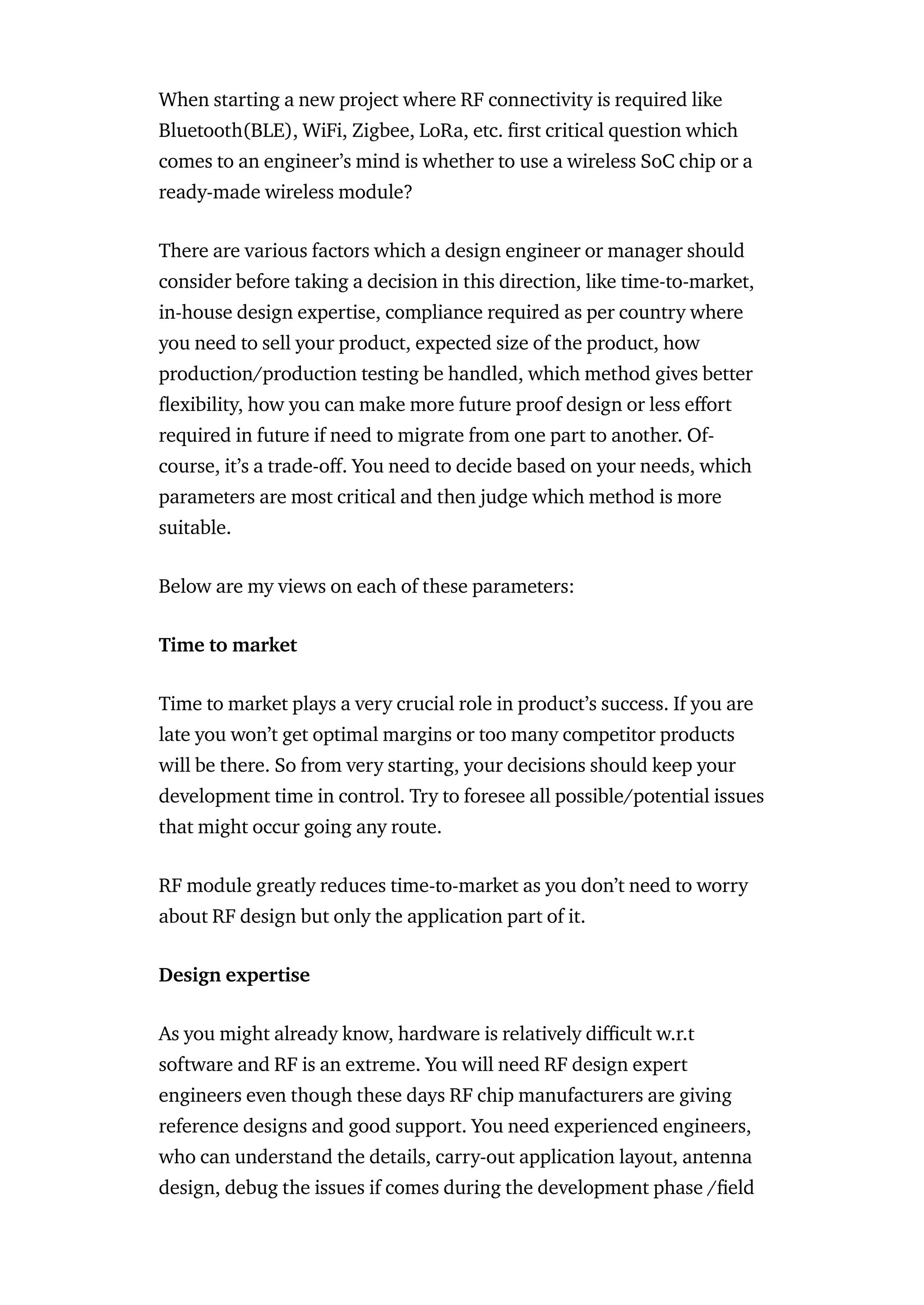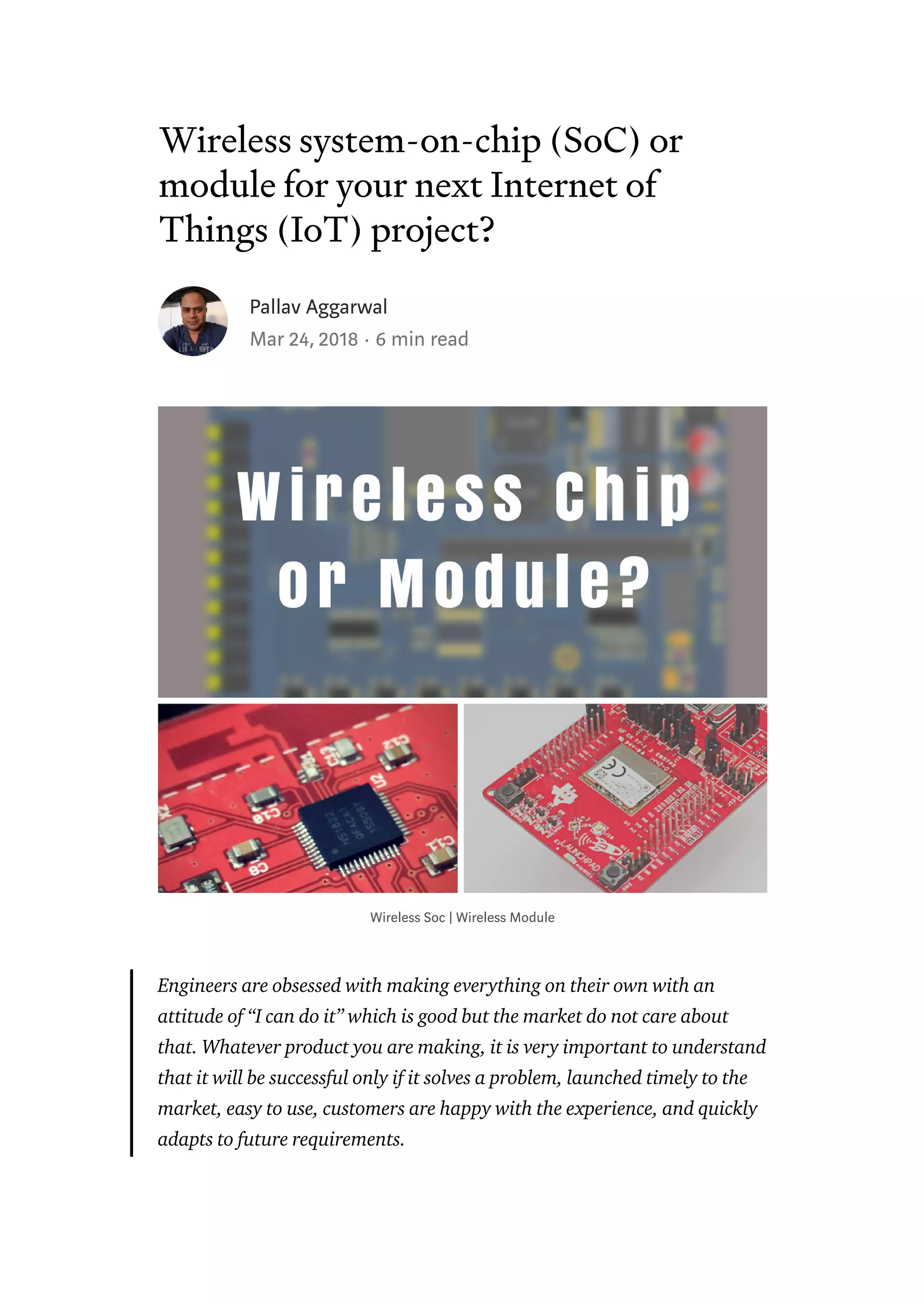 The document discusses the considerations for engineers when deciding between a wireless system-on-chip (SoC) and a ready-made wireless module for Internet of Things (IoT) projects. Factors such as time to market, design expertise, compliance, cost, and future-proofing are highlighted as critical in making this decision. Ultimately, for low-volume products, modules may be preferable due to their simplicity, while high-volume products may warrant a chip-based design despite the challenges involved.