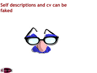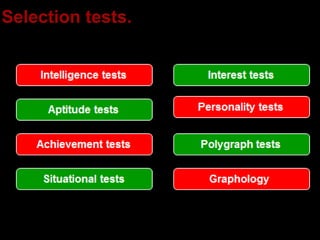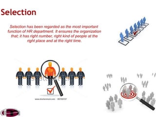 The document discusses selection as the most important function of HR to ensure the right candidate is hired. It notes it is better to not select than select the wrong candidate. The objective of selection is to choose the most suitable candidate. There are two basic testing concepts - reliability, which is consistency of measurement, and validity, which is the extent to which a test measures what it claims to measure. The selection process involves preliminary interviews, selection tests, employment interviews, reference and background checks, a selection decision, physical examinations, a job offer, and contract of employment.