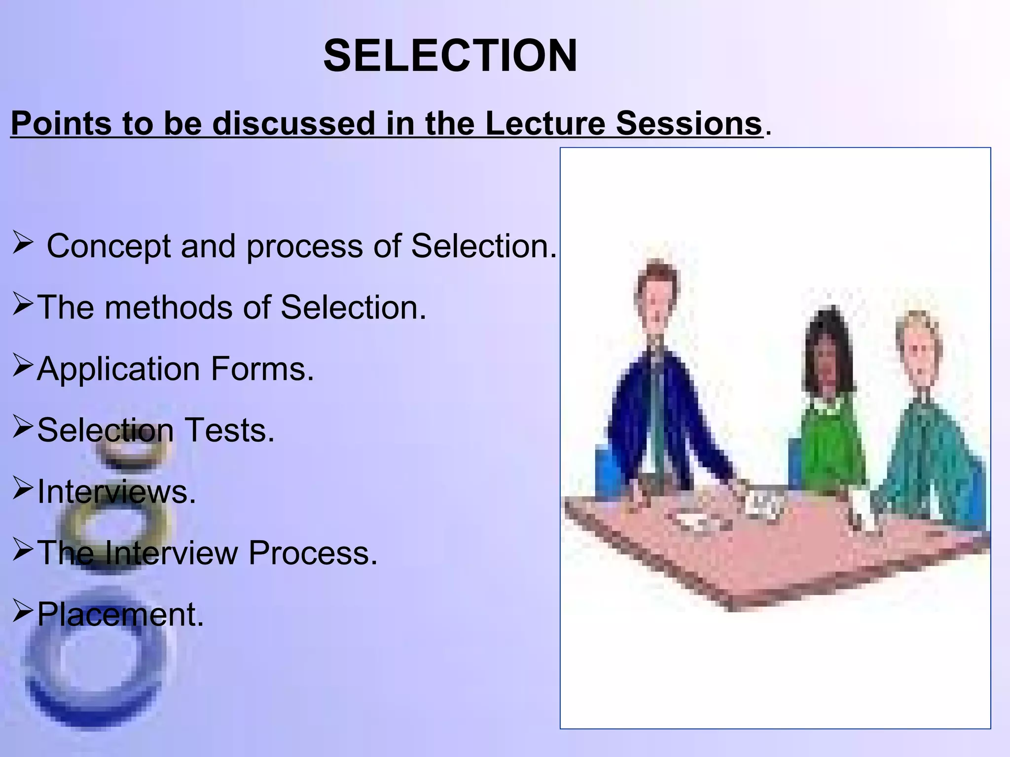 This document discusses the selection process for hiring employees. It begins by outlining the key points that will be covered, including the concept and methods of selection, application forms, selection tests, and interviews. It then provides details on each step of the selection process, from initial application to job offer and placement. Various selection methods like application forms, tests, and interviews are explained. Common types of tests for measuring intelligence, aptitude, interests and personality are defined. The document concludes by giving examples of selection procedures used by different companies.