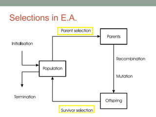 This document discusses various selection methods used in evolutionary algorithms. It describes parent selection methods like roulette wheel selection and tournament selection that determine which individuals are chosen to reproduce offspring. It also covers survivor selection/replacement methods like steady state, elitist, and generation replacement that determine which individuals survive to the next generation. The document provides details on how each method works and its advantages/disadvantages.