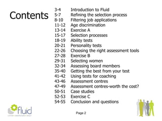 The document outlines strategies for assessing and selecting job applicants, emphasizing the importance of refining the selection process and using appropriate assessment tools. It discusses age discrimination laws, the significance of clear job descriptions, and methods for filtering applicants effectively. Additionally, it covers various testing methods and the benefits of diverse hiring practices, particularly regarding the selection of women and board members.