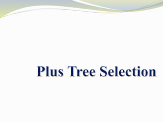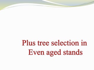 3. Recurrent selection which involves multiple cycles of selection and breeding. Family plus within-family selection is the predominant method used in most tree improvement programs. Guidelines for selecting trees from even-aged stands and plantations are also provided.