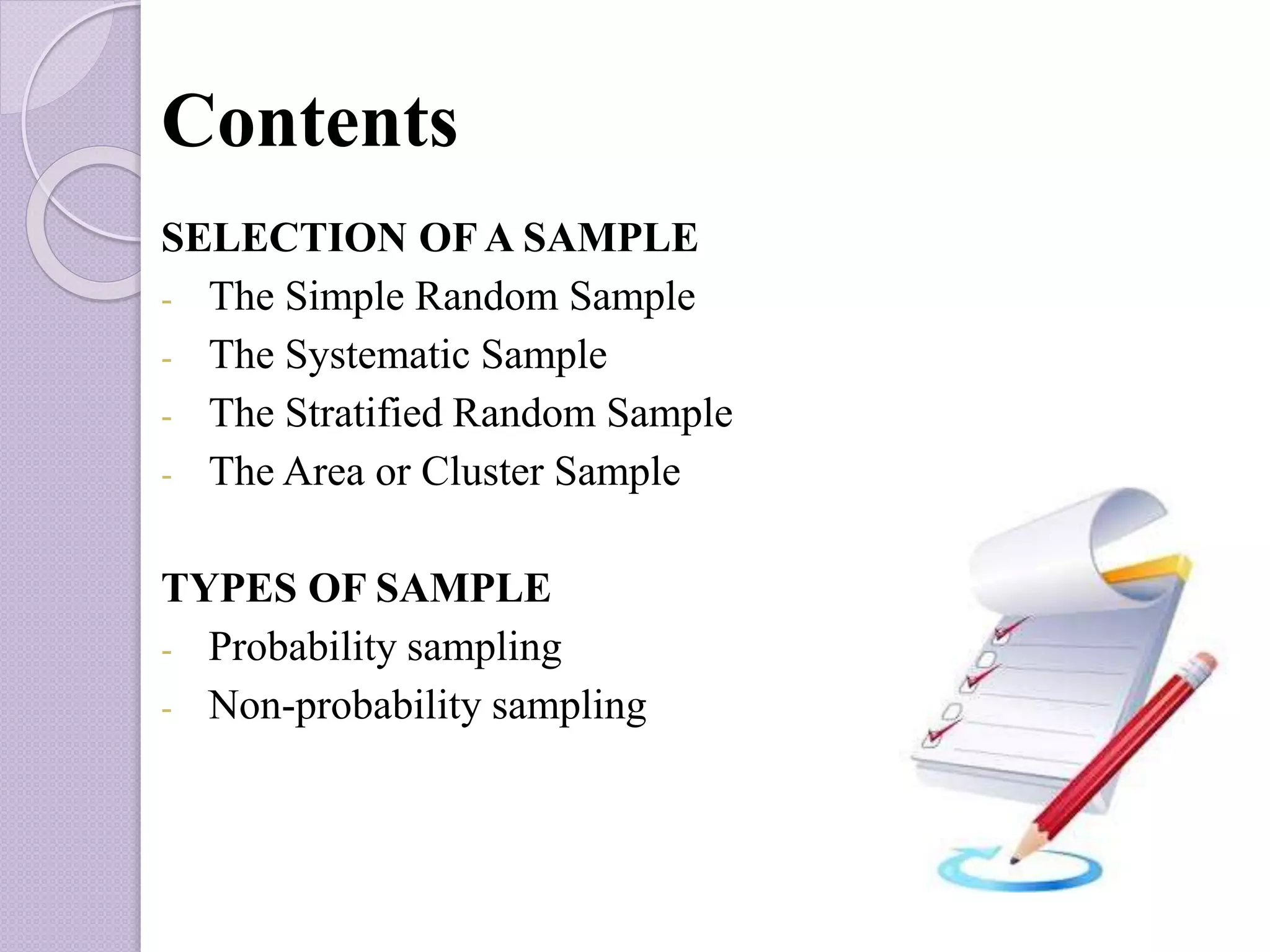 This document discusses different sampling methods for selecting a representative subset of a population for research purposes. It describes probability sampling methods like simple random sampling, stratified random sampling, and cluster sampling, where every member of the population has a chance of being selected. It also covers non-probability sampling techniques like convenience sampling and purposive sampling. The key advantages of sampling are that it is more time-efficient, cost-effective, and allows examining the population in greater detail than a census. Probability sampling aims to select a truly random and representative sample, while non-probability sampling does not give all population members an equal chance of selection.