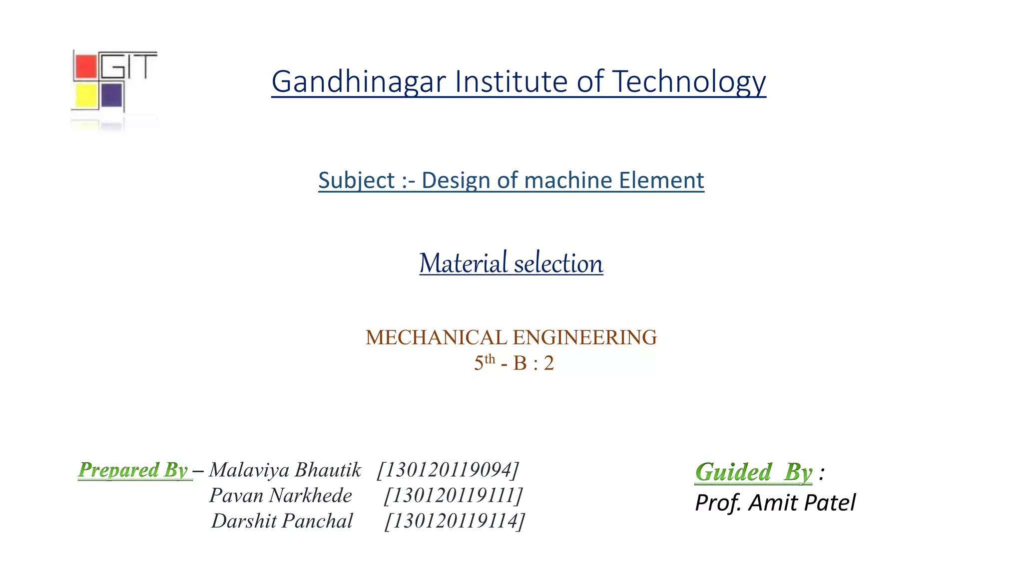 The document discusses material selection criteria for machine element design, highlighting factors like availability, cost, mechanical properties, and manufacturing considerations. It provides examples of commonly used engineering materials such as cast iron, alloy steel, plastics, and aluminum alloys, along with their properties and applications. Additionally, it outlines suitable materials for specific machine parts based on their mechanical requirements.