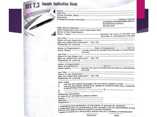 The document outlines the selection process in recruitment, emphasizing its importance in identifying suitable candidates and avoiding costly mismatches. It details the steps involved in selection, including screening interviews, application blanks, tests, medical examinations, reference checks, and hiring decisions. The document also highlights issues like credential fraud and provides case studies illustrating negative outcomes due to negligent hiring practices.