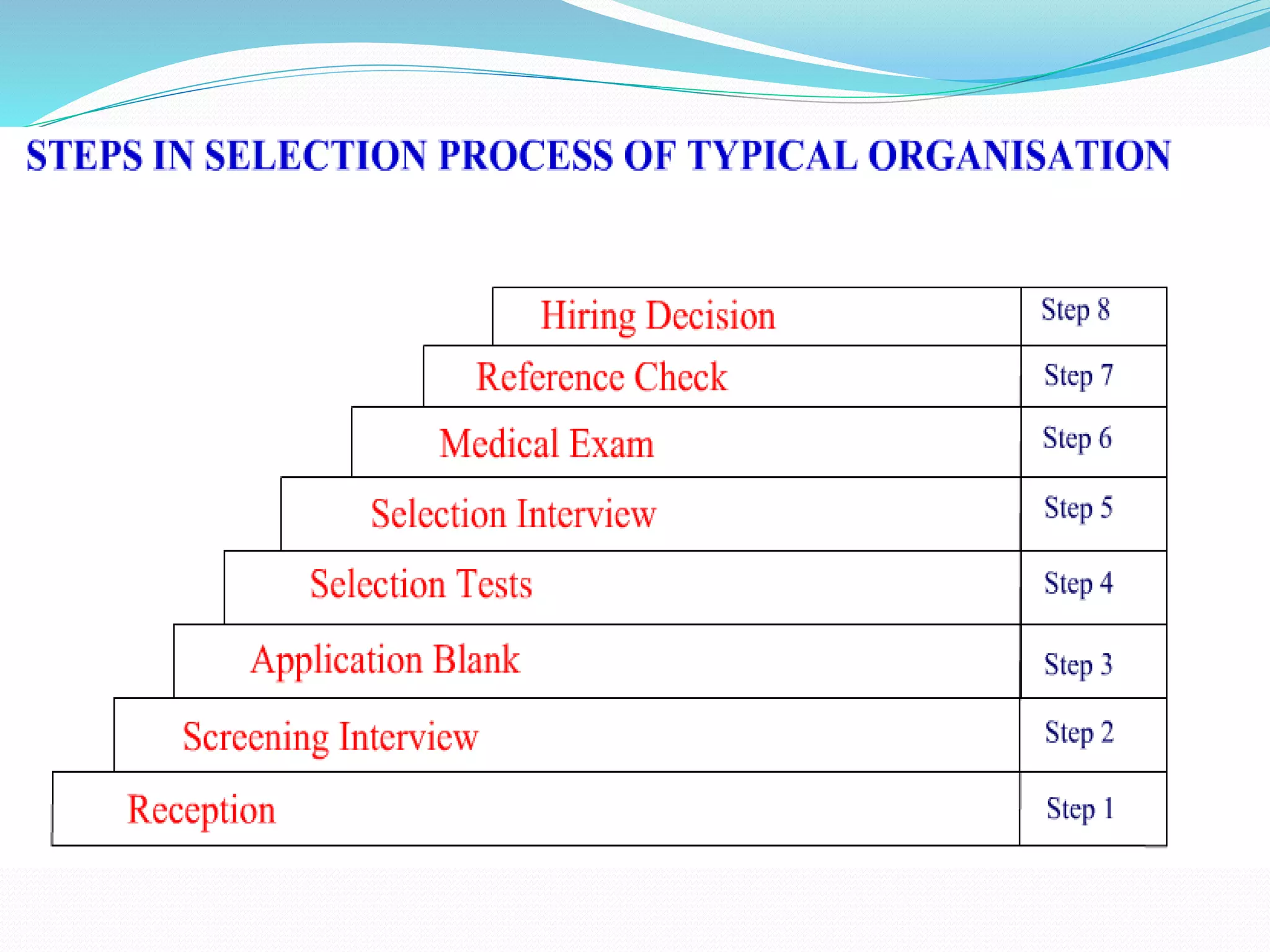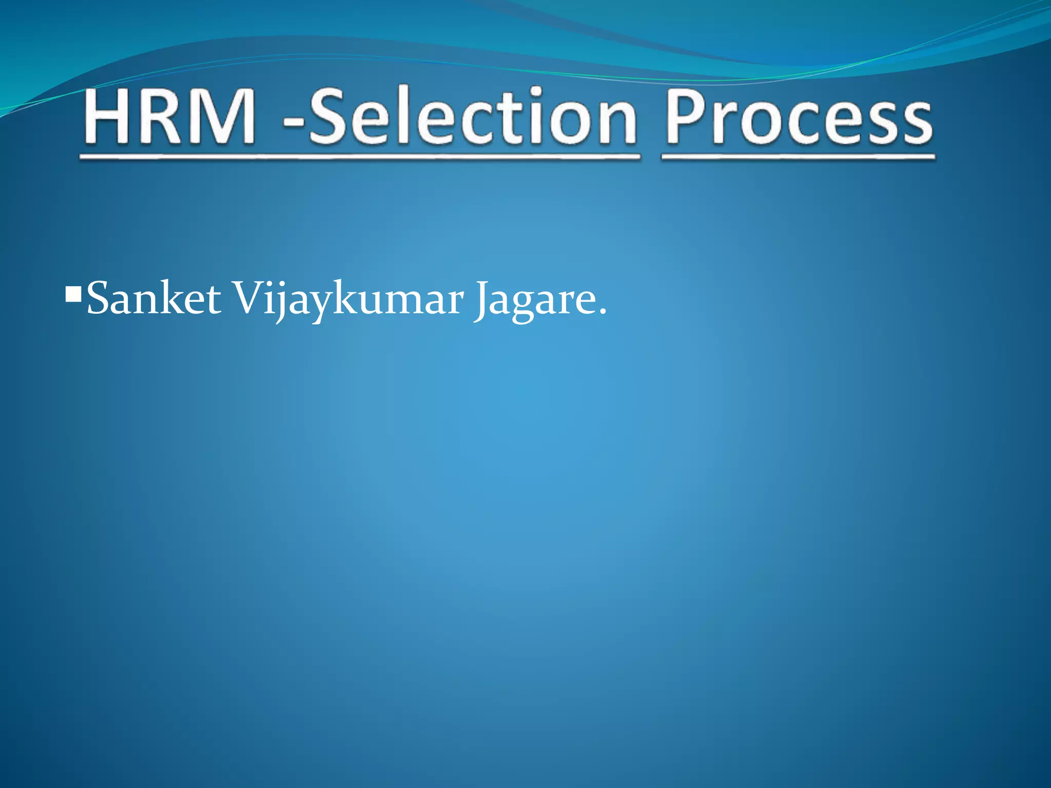 The document discusses the process of selecting candidates for jobs. It defines selection as choosing individuals with relevant qualifications. The purpose is to find the most suitable candidate for an organization's requirements. The process involves screening applicants, using application forms and weighted application blanks to collect information. Selection testing measures performance, behavior, and attitudes through intelligence, aptitude, personality, achievement, and simulation tests. Assessment centers also evaluate candidates. Interviews are conducted to further assess candidates. Medical examinations, reference checks, and a final hiring decision complete the selection process.