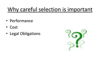 This document discusses the importance of careful selection and provides guidance on developing and implementing a selection process. It outlines key considerations for developing valid tests, conducting effective interviews, and ensuring legal compliance. The document emphasizes analyzing jobs to determine requirements, selecting valid tests that measure relevant criteria, structuring interviews to obtain predictive information, and periodically revalidating the selection program. A variety of tests, interviews, background checks and other procedures are described to inform comprehensive selection.
