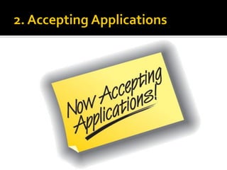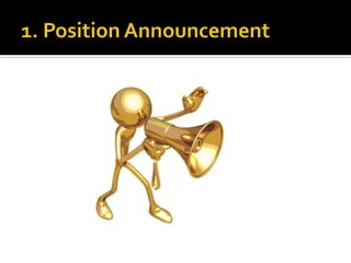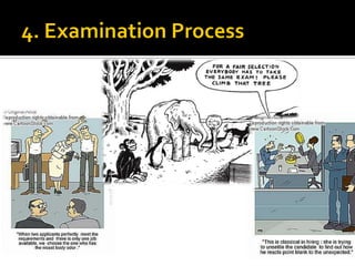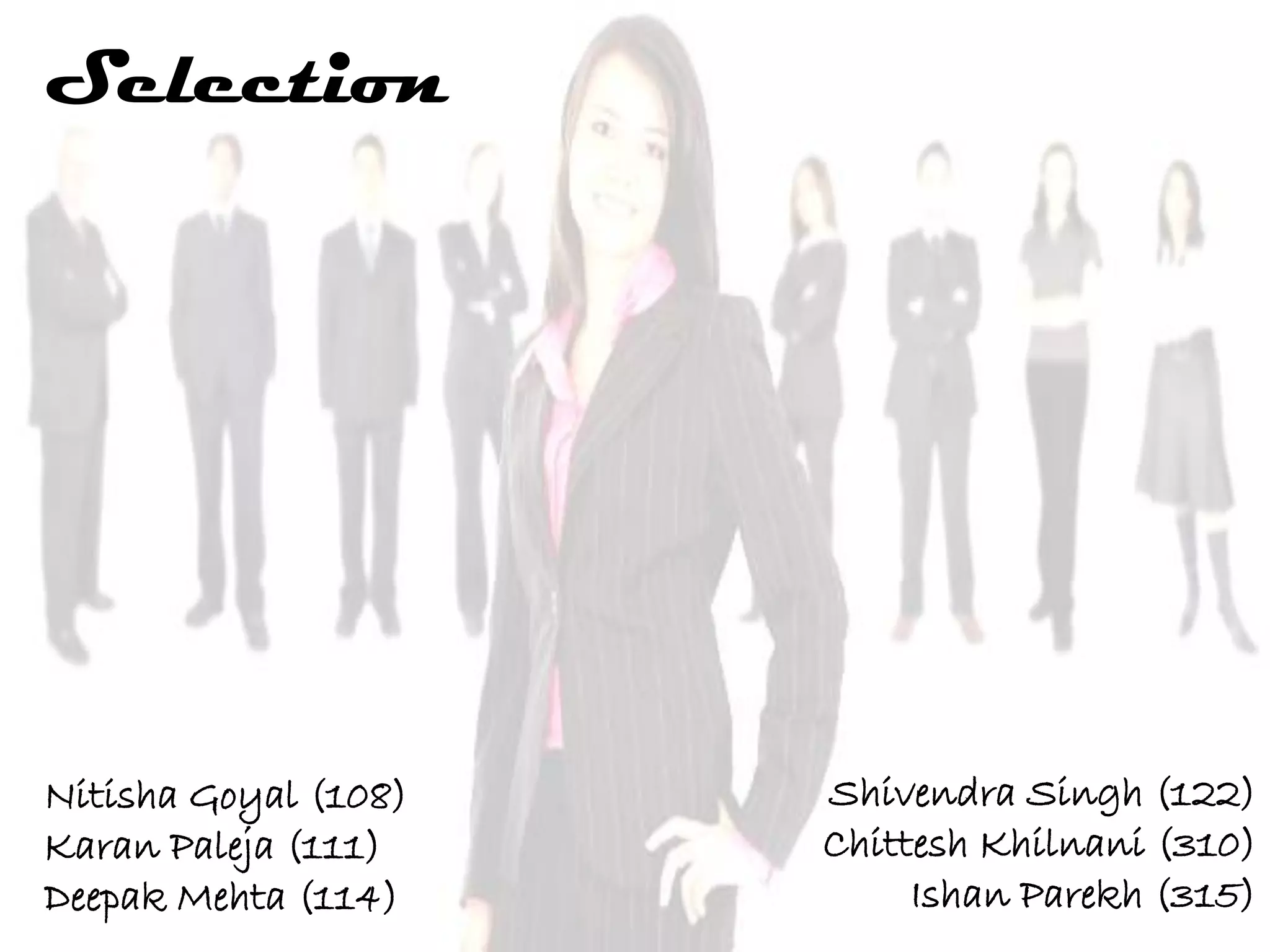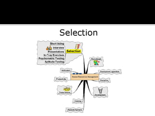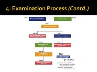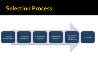 The document discusses the selection process at Google Inc. It begins by outlining the different levels in Google's organizational structure from top management to workforce. For selection from outside, the process involves an application, written and aptitude tests, technical and non-technical interviews, case study analysis, and group discussions. For selection from inside, the process focuses on performance, interviews, leadership quality, presentations, and case study analysis. The process concludes with offers and negotiations.