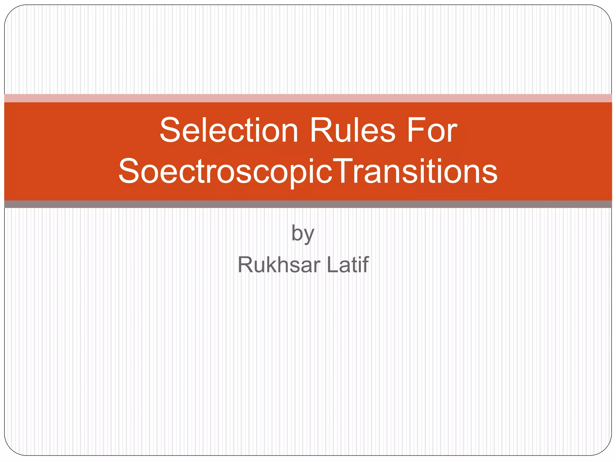 This document discusses selection rules and photochemistry concepts. It describes three main selection rules that govern transitions in complex metal ions: spin selection rules, orbital selection rules, and Laporte selection rules. Spin selection rules state that transitions can only occur between states of the same spin and multiplicity. Orbital selection rules indicate that d-d transitions are usually forbidden but can be partially allowed. Laporte selection rules are based on parity and state that transitions between states of the same parity are forbidden. The document also discusses the Franck-Condon principle and provides an abstract on photochemistry occurring on particulate matter and within liquid droplets.