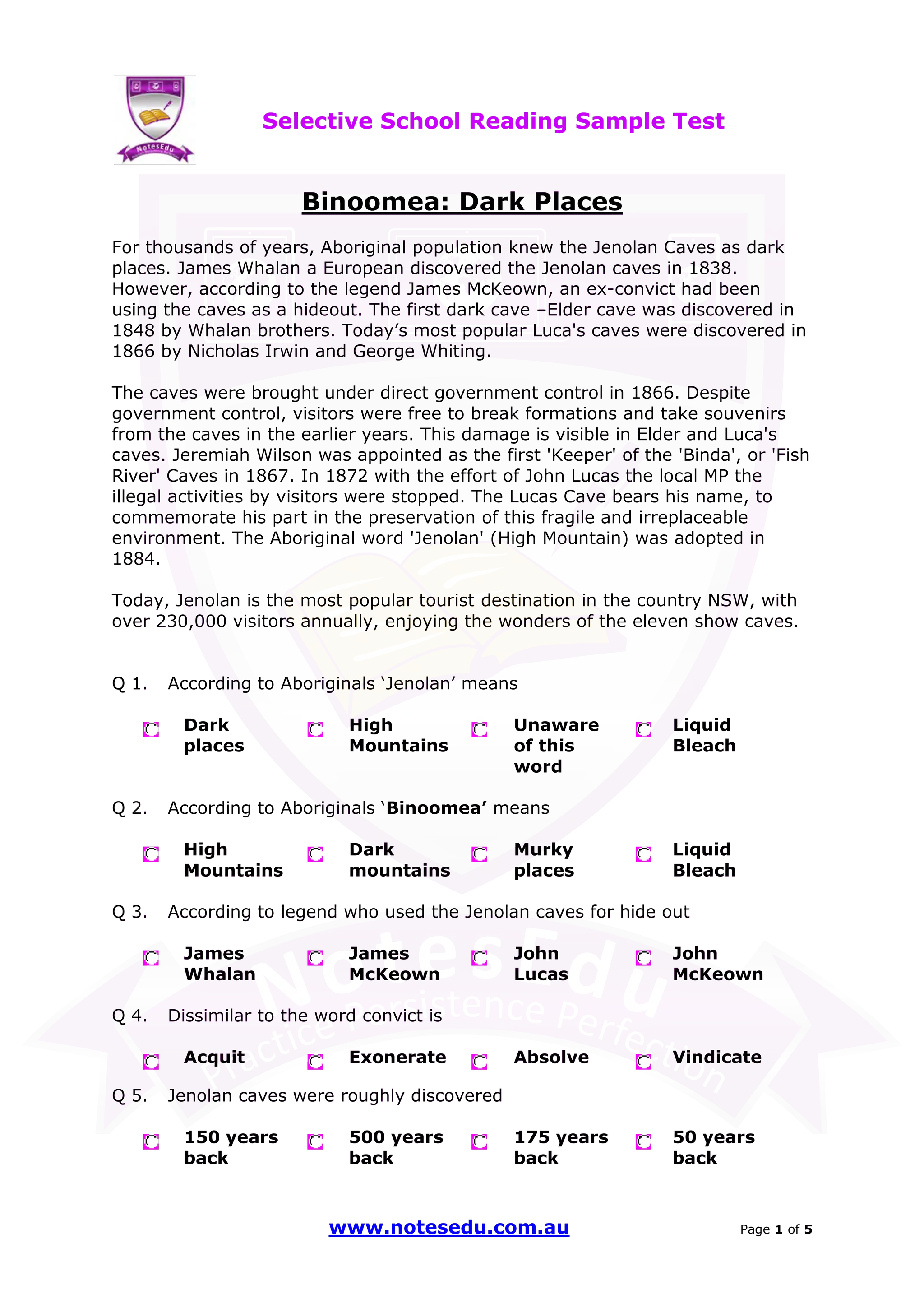 The document discusses the history and significance of the Jenolan Caves, known as 'dark places' by Aboriginal people, with European discovery marked by James Whalan in 1838 and subsequent cave preservation efforts initiated in 1866. It also includes an analysis of Robert Frost's poem 'Stopping by Woods on a Snowy Evening,' examining themes such as the relationship between the narrator and his horse. Additionally, the document references various questions and answers related to the readings, serving as a selective school reading sample test.