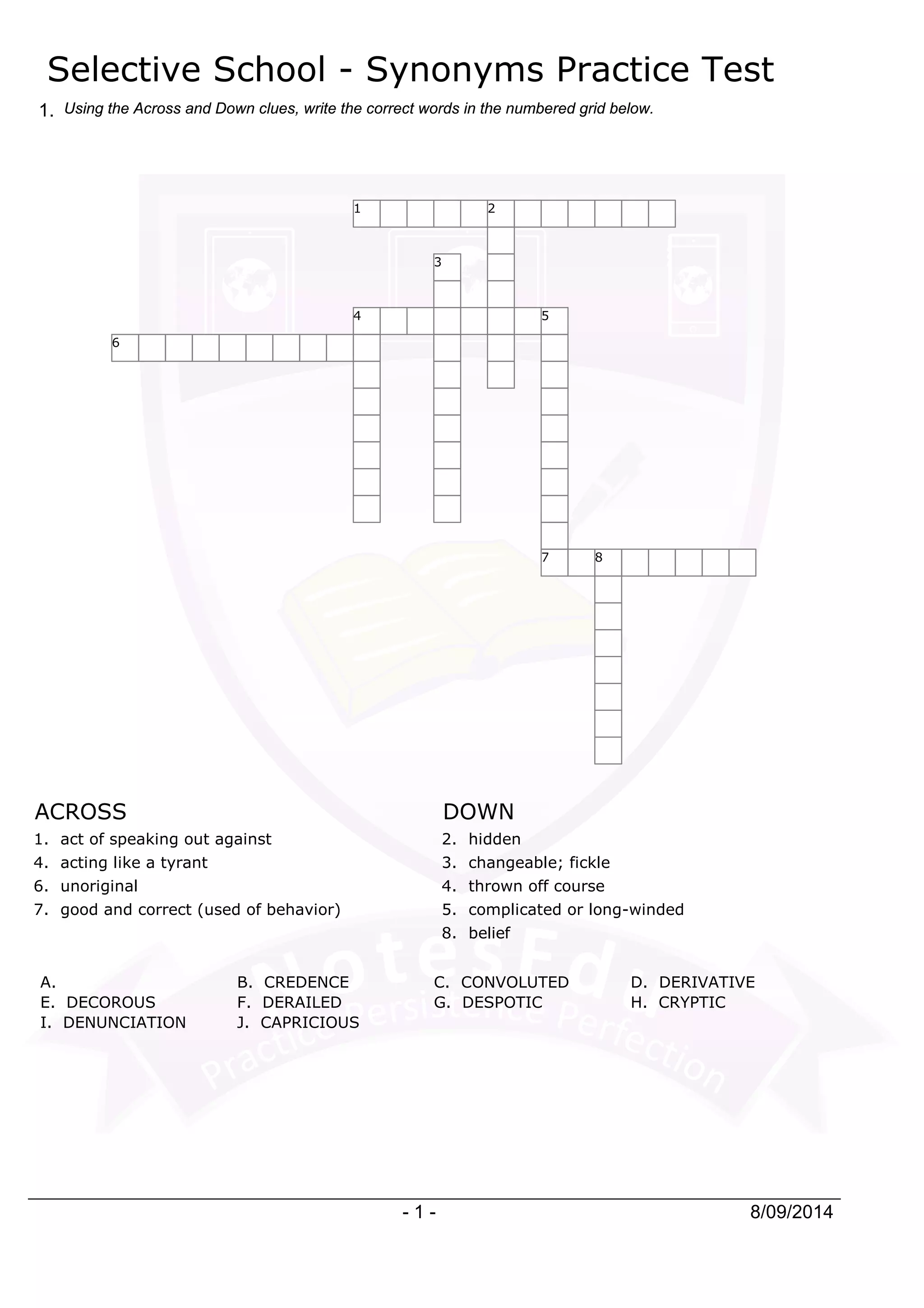 This document is a selective school synonyms practice test that includes a grid for filling in answers based on definitions provided for various words. Additionally, it offers instructions for accessing further resources and online tests related to notesedu. Links to social media and a reminder for those under 13 not to follow certain platforms are also included.