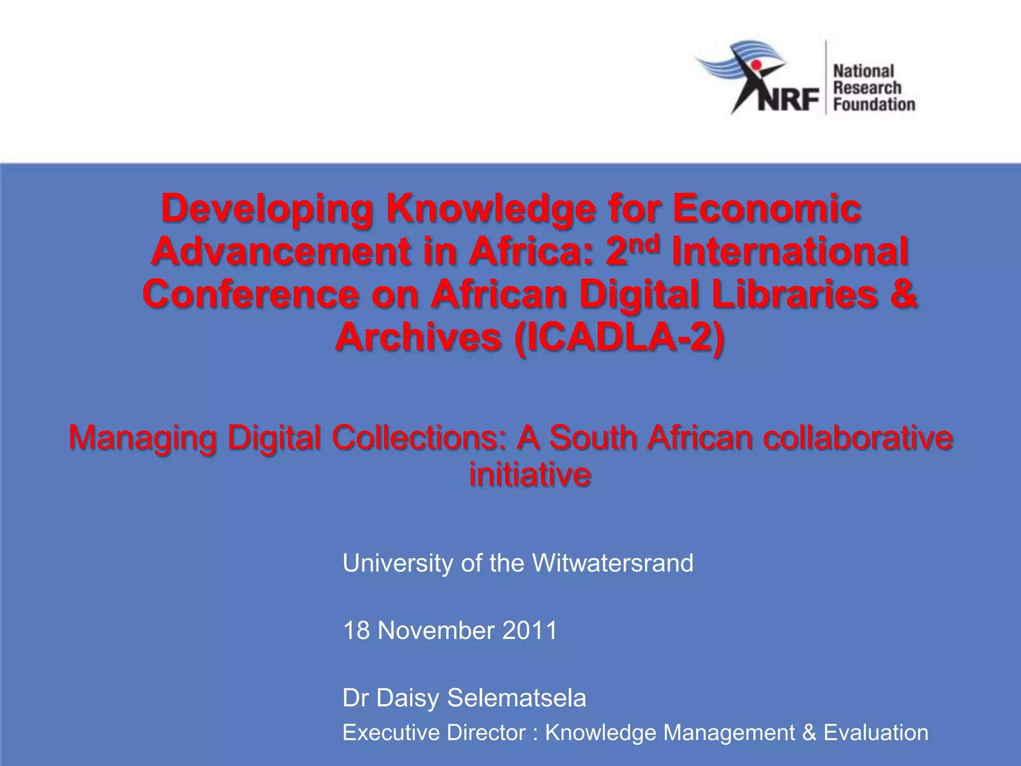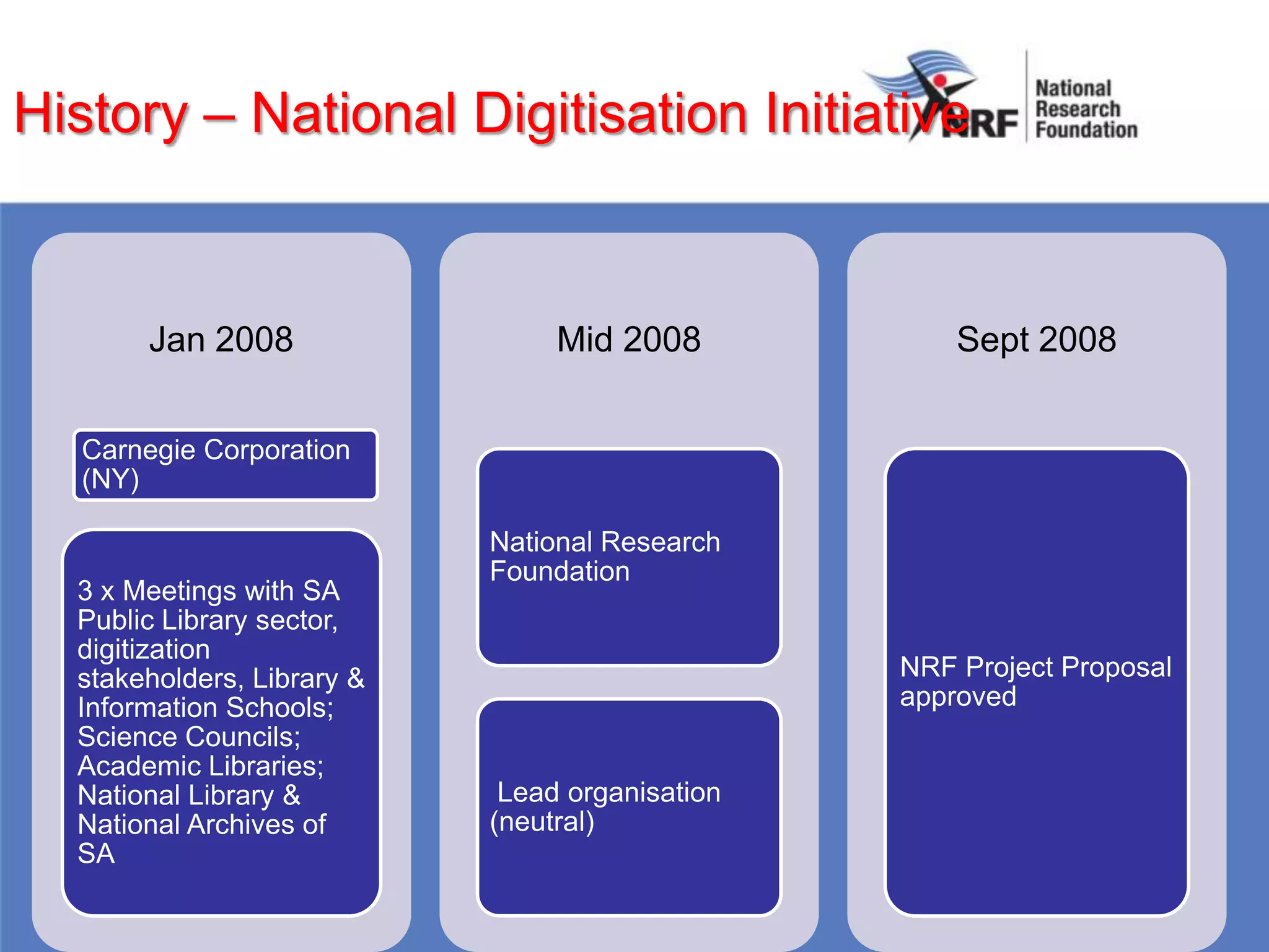 The document discusses the strategies and outcomes of the National Digitisation Initiative in South Africa, highlighting its role in managing digital collections and enhancing knowledge for economic advancement. It outlines the establishment of a framework for audit, training, and stakeholder engagement to improve digital preservation and accessibility of cultural heritage. Key objectives include developing standards, facilitating skills development, and promoting collaboration among institutions involved in digitisation projects.