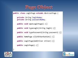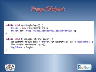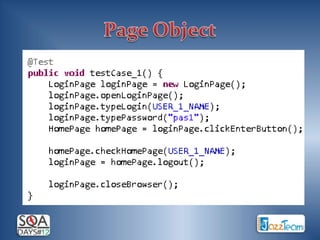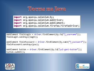 Документ описывает стратегию создания автотестов для web-приложений с помощью Selenium, включая четыре основных метода: автосгенерированные, процедурные, объектно-ориентированные и с использованием фреймворков. Рассматриваются особенности каждого метода, включая их преимущества и недостатки, а также примеры тестов. Также упоминается использование фреймворка xml2selenium для упрощения и ускорения процесса создания тестов.