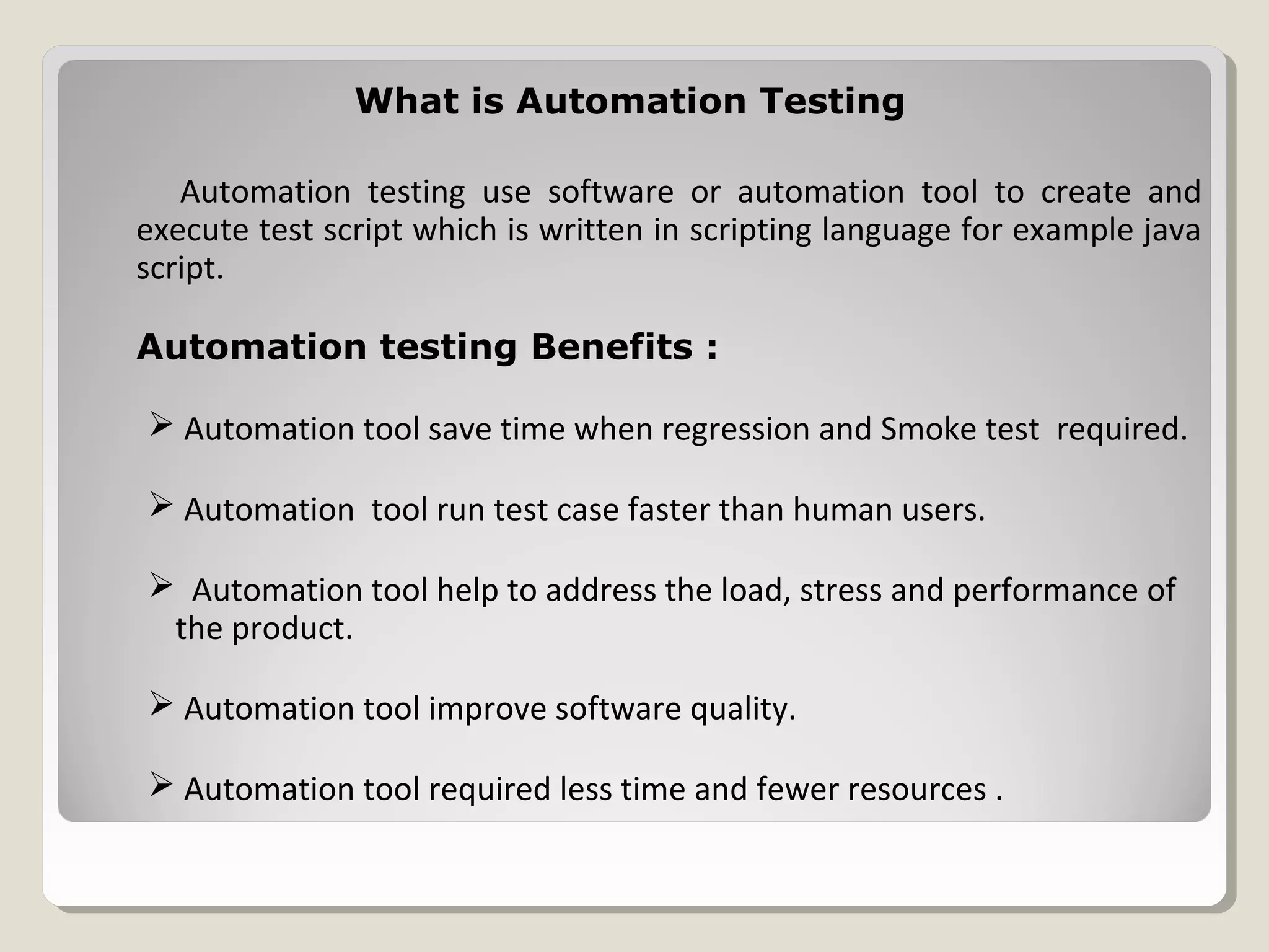 The document discusses automation testing and provides details about Selenium, an open source automation testing tool used to automate testing of web and mobile applications. It explains how Selenium IDE can be used to record test scripts and convert them to different programming languages like Java, and how the recorded scripts can then be run using Selenium WebDriver in Eclipse IDE. The document also provides steps to install Selenium IDE plugin, record and export test scripts, configure projects in Eclipse, and run the automated tests.