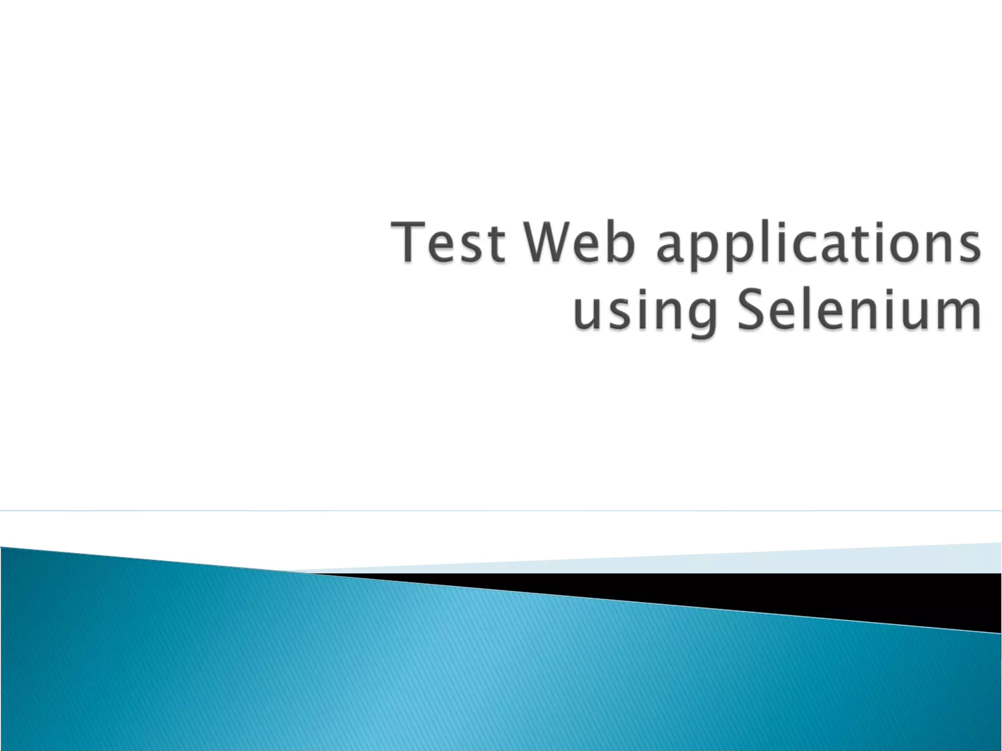 The document discusses testing web applications using Selenium. It describes the unique challenges of testing heterogeneous systems with dynamic pages. It then provides an overview of Selenium and how it can be used to simulate user interactions and automate testing of web applications. Specific techniques discussed include using Selenium IDE to record tests and Selenium WebDriver to programmatically control browsers using various programming languages.