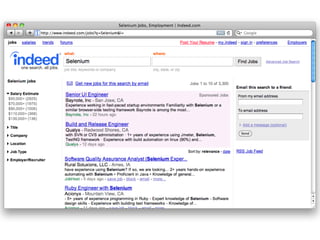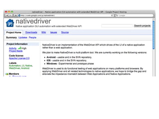 The document presents an overview of Selenium, including its development by Jason Huggins and its evolution from Selenium 1 to Selenium 2, highlighting features such as native app testing and improved API architecture. It discusses the importance of testing, common challenges faced by testers, and proposes solutions to enhance testing efficiency. Additionally, it introduces the BitbeamBot, a robotic application that utilizes Selenium for testing mobile applications in real-world scenarios.
