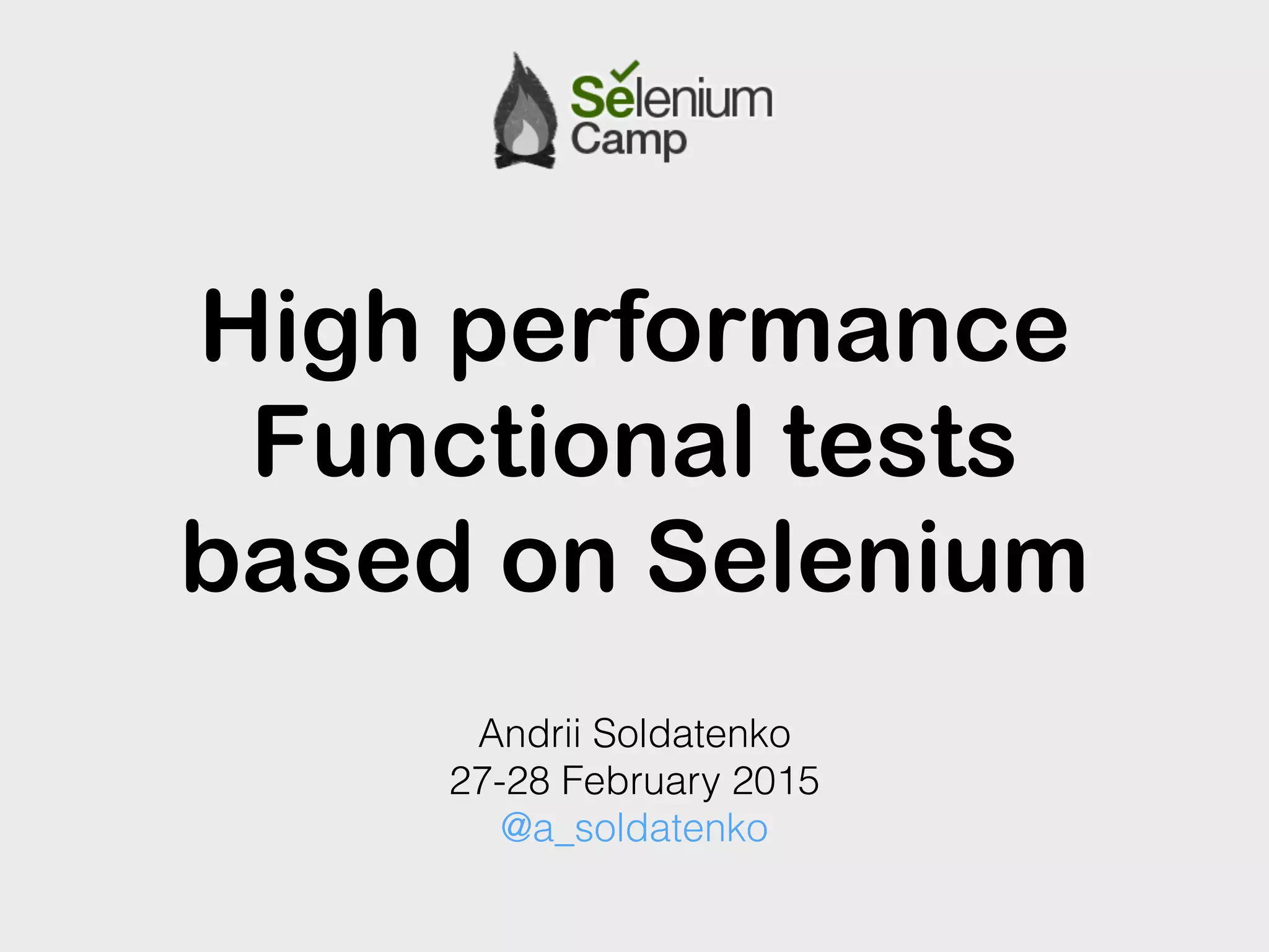 This document discusses high performance functional testing based on Selenium. It begins with an introduction of the speaker and outlines a testing pyramid with unit, integration and functional/UI tests. It then demonstrates how to automate functional tests for web applications using Selenium and discusses techniques for decreasing test execution time, including using Selenium Grid, PhantomJS, HTTP requests instead of Selenium, and parallel test execution. The document emphasizes that faster tests allow for faster development and provides approaches and tools to reduce test bottlenecks and optimize test execution time.