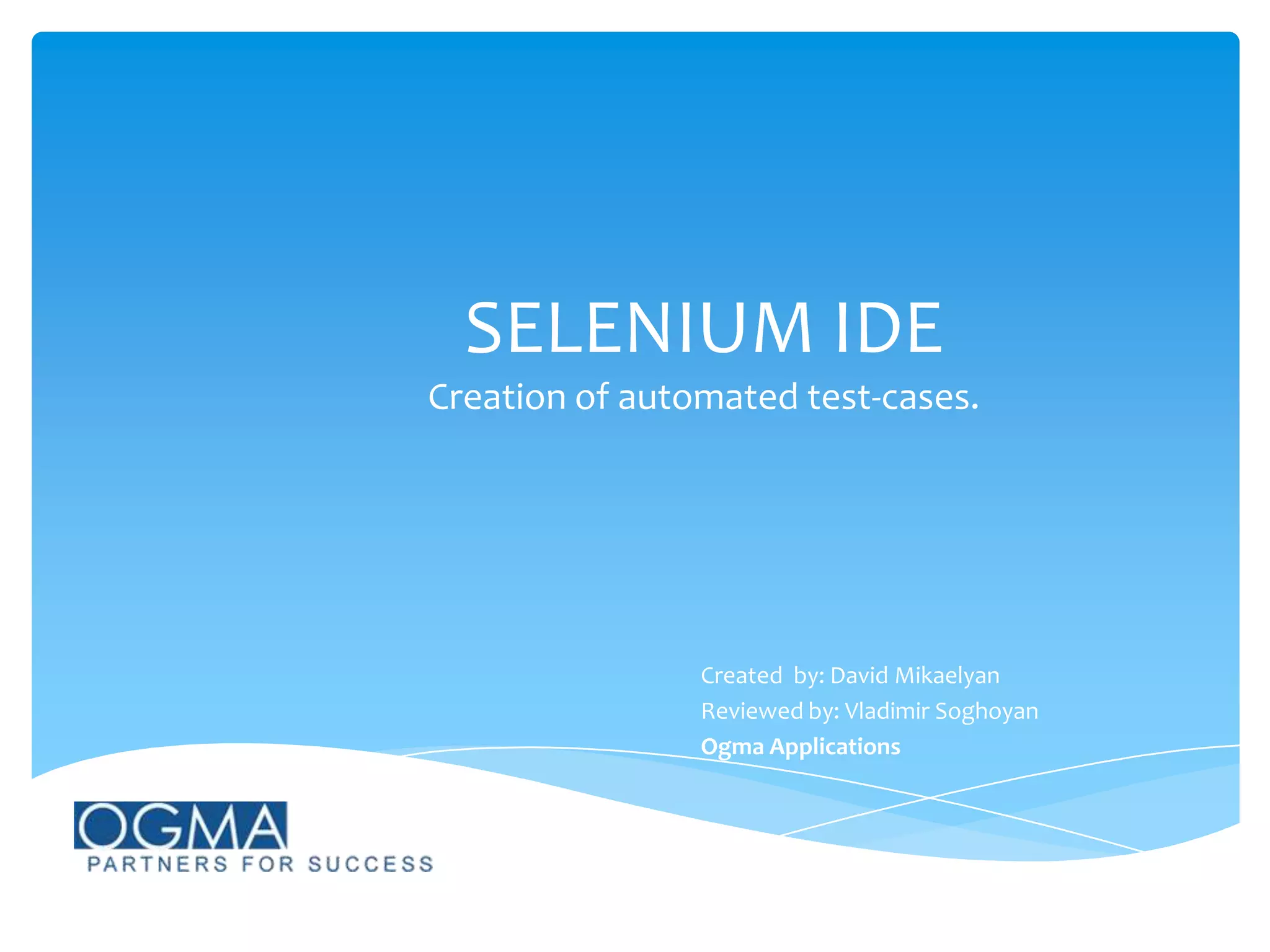 The document provides an overview of Selenium IDE, a Firefox extension for recording, editing, and debugging automated test cases for HTML. It outlines the creation process for automated test cases and test suites, as well as the use of user extensions to enhance functionality. Key features include intelligent field selection, auto-completion of commands, and the ability to save commands in an HTML table format.