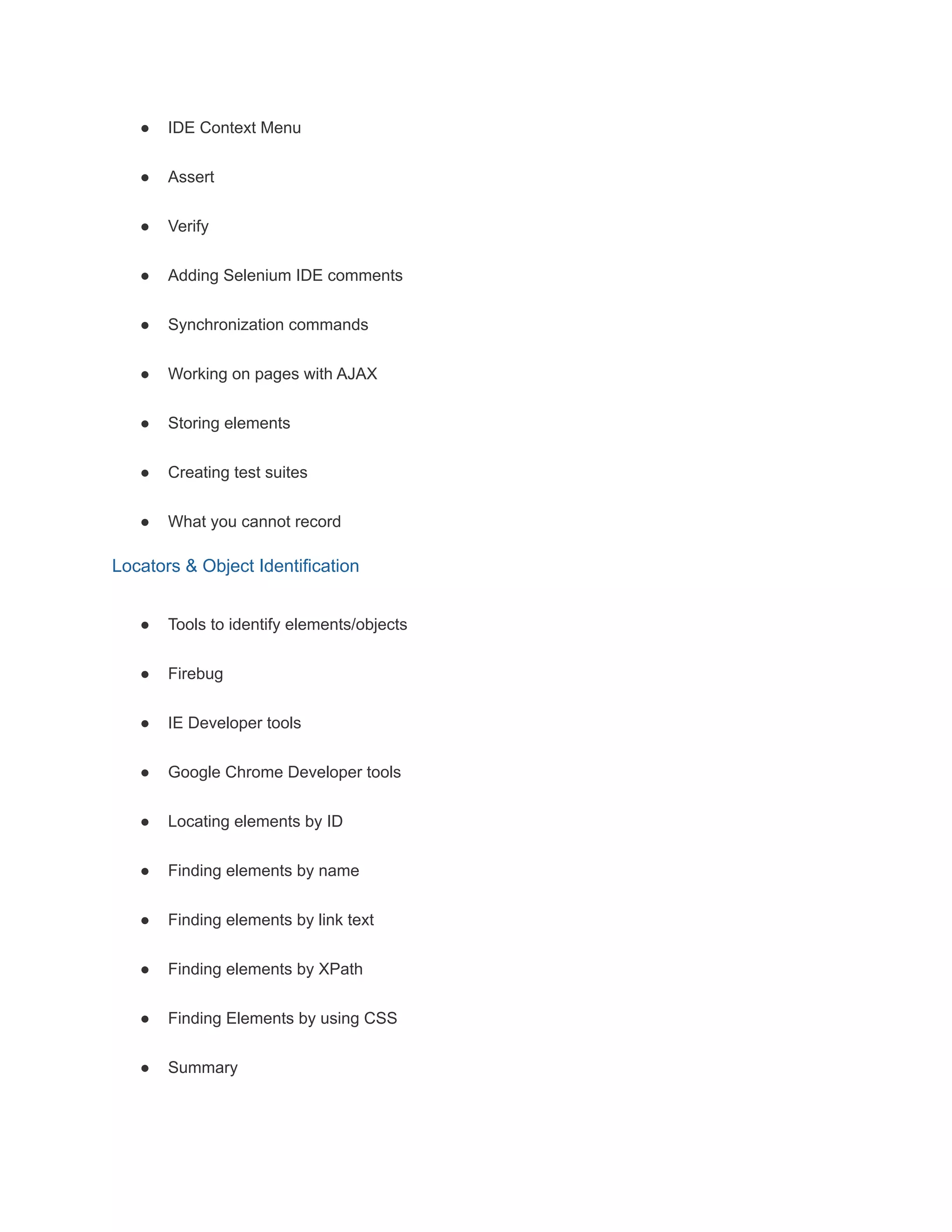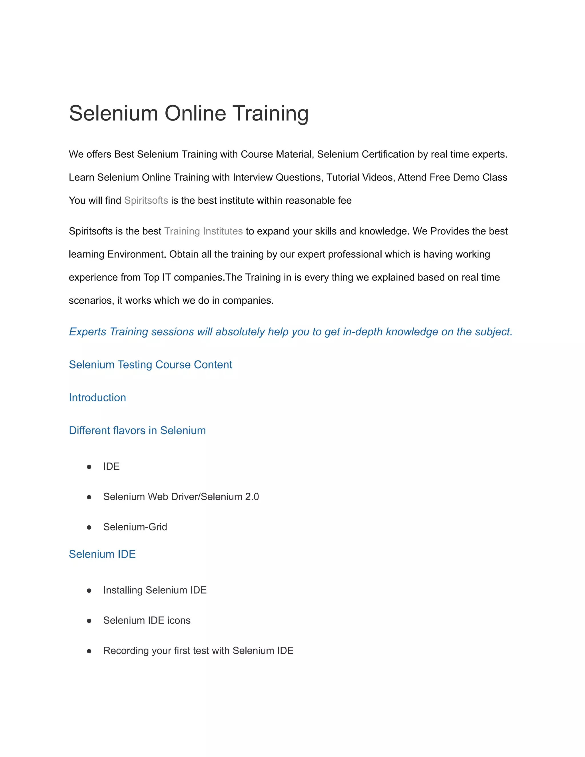 The document provides an extensive overview of an online Selenium training program offered by Spiritsofts, which includes course materials, certification, and training from industry experts. It covers various topics such as Selenium IDE, Web Driver, Java programming, TestNG, Maven, database testing, and automation frameworks. The curriculum is designed to equip learners with practical knowledge and skills relevant to real-world scenarios in software testing.