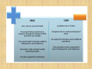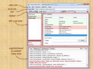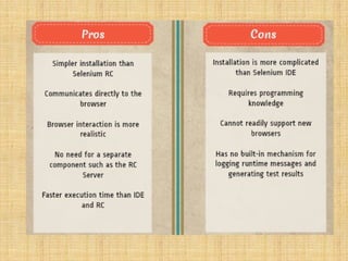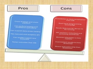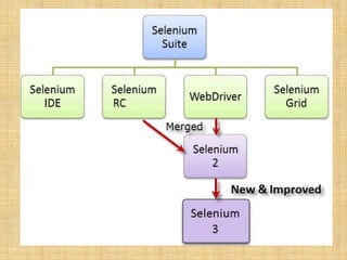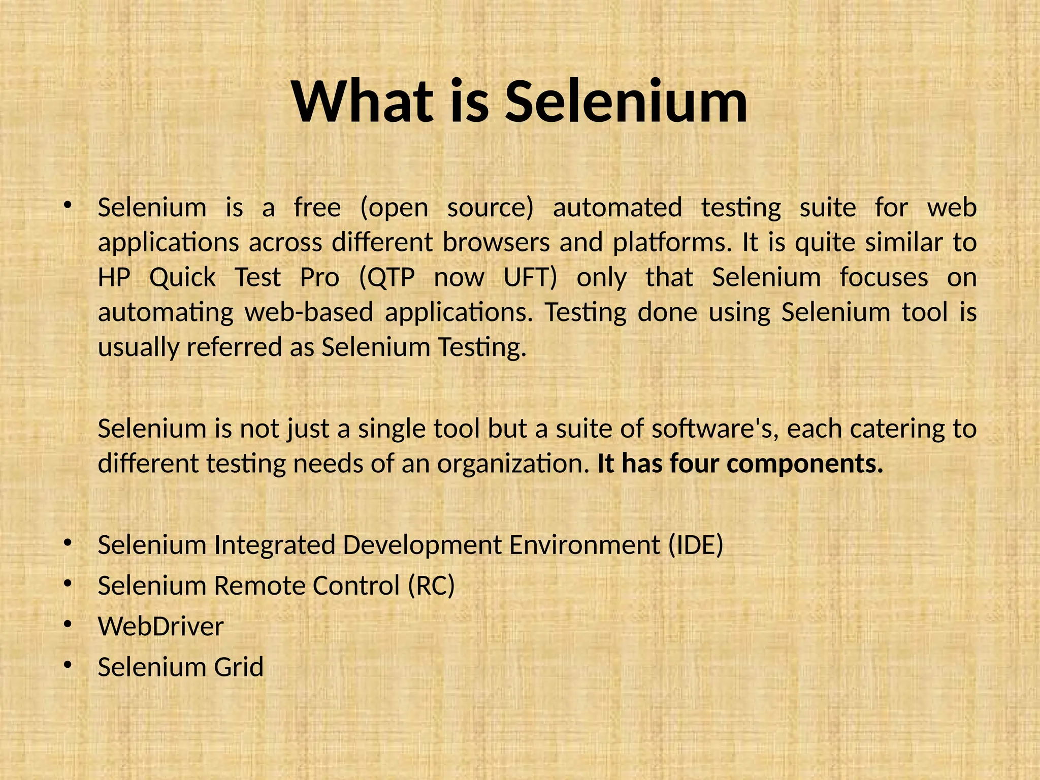 Selenium is an open-source automated testing suite for web applications, consisting of four components: Selenium IDE, Selenium Remote Control (RC), WebDriver, and Selenium Grid. It was created by Jason Huggins in 2004 to automate web testing, with Selenium RC allowing the use of various programming languages for complex tests, while WebDriver offers direct communication with browsers. Selenium Grid facilitates parallel testing across different browsers and machines, enhancing efficiency compared to other tools like QTP.