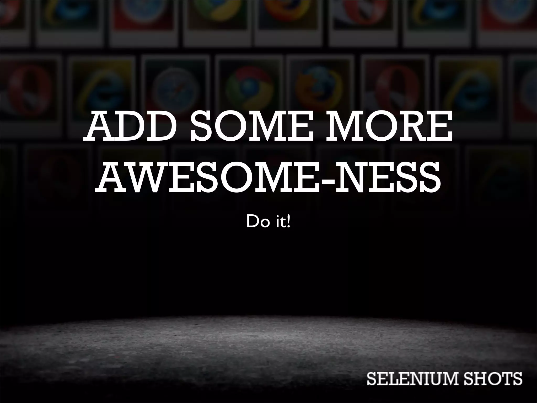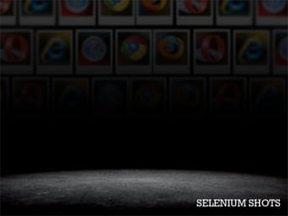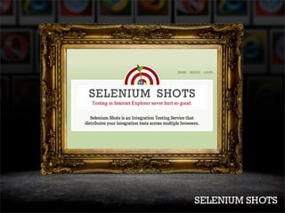 This document discusses an integration testing service called Selenium Shots that allows developers to automatically test their websites across different browsers and operating systems. It notes that manual testing can be boring and inconsistent, while writing test plans is time-consuming. The document then provides instructions on how to set up and configure Selenium Shots by installing the gem, creating a test project, and writing code to integrate the tests.